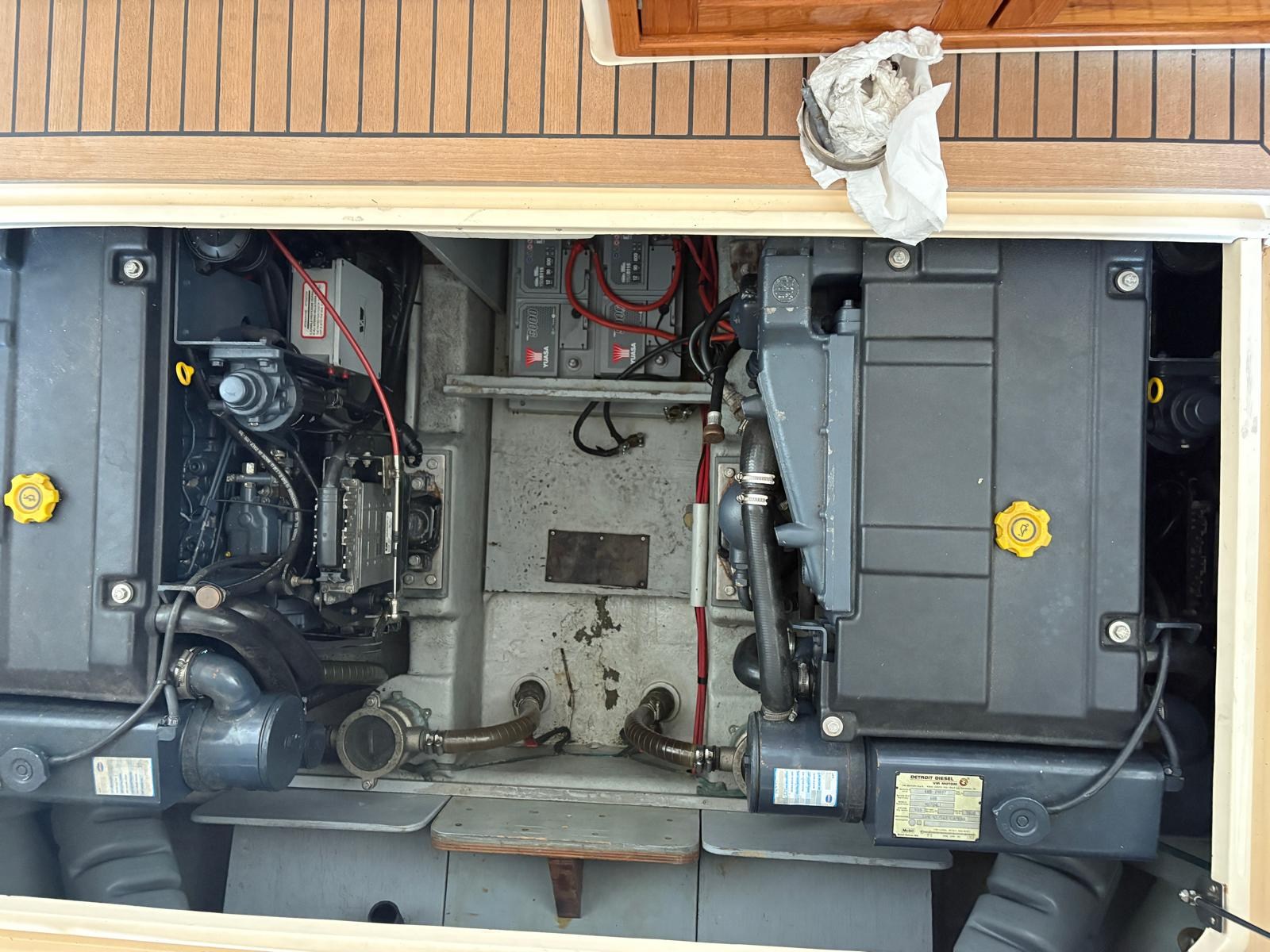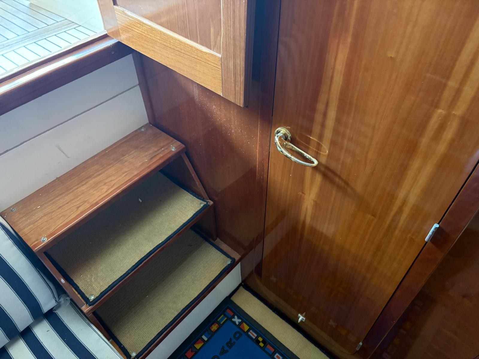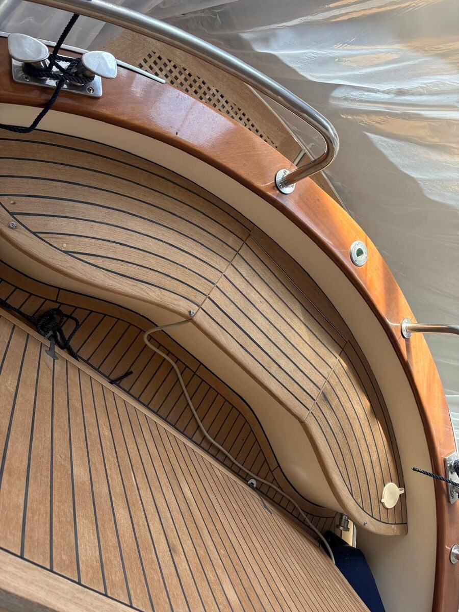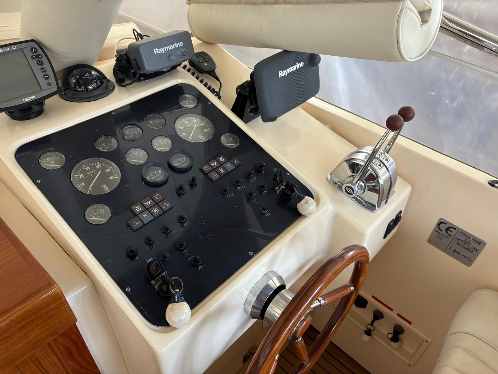 2 Engine Alarm, Bilge Alarm, Water pressure pump, Teak Side Decks, Shore power cable, Special Colour (Blu navy), Guard rail, Deck Shower, 2 Hydraulic Flaps, 2 Flaps Indicators, Washbasin in the cockpit, Courtesy Lights, Fenders, Gangway, Platform, Automatic Bilge Pump, Teak deck, Entry door, Teak Cockpit, Shorepower connector, Rollbar, Electric Windlass, swimming ladder, cockpit table, Horn, Bow Winches.