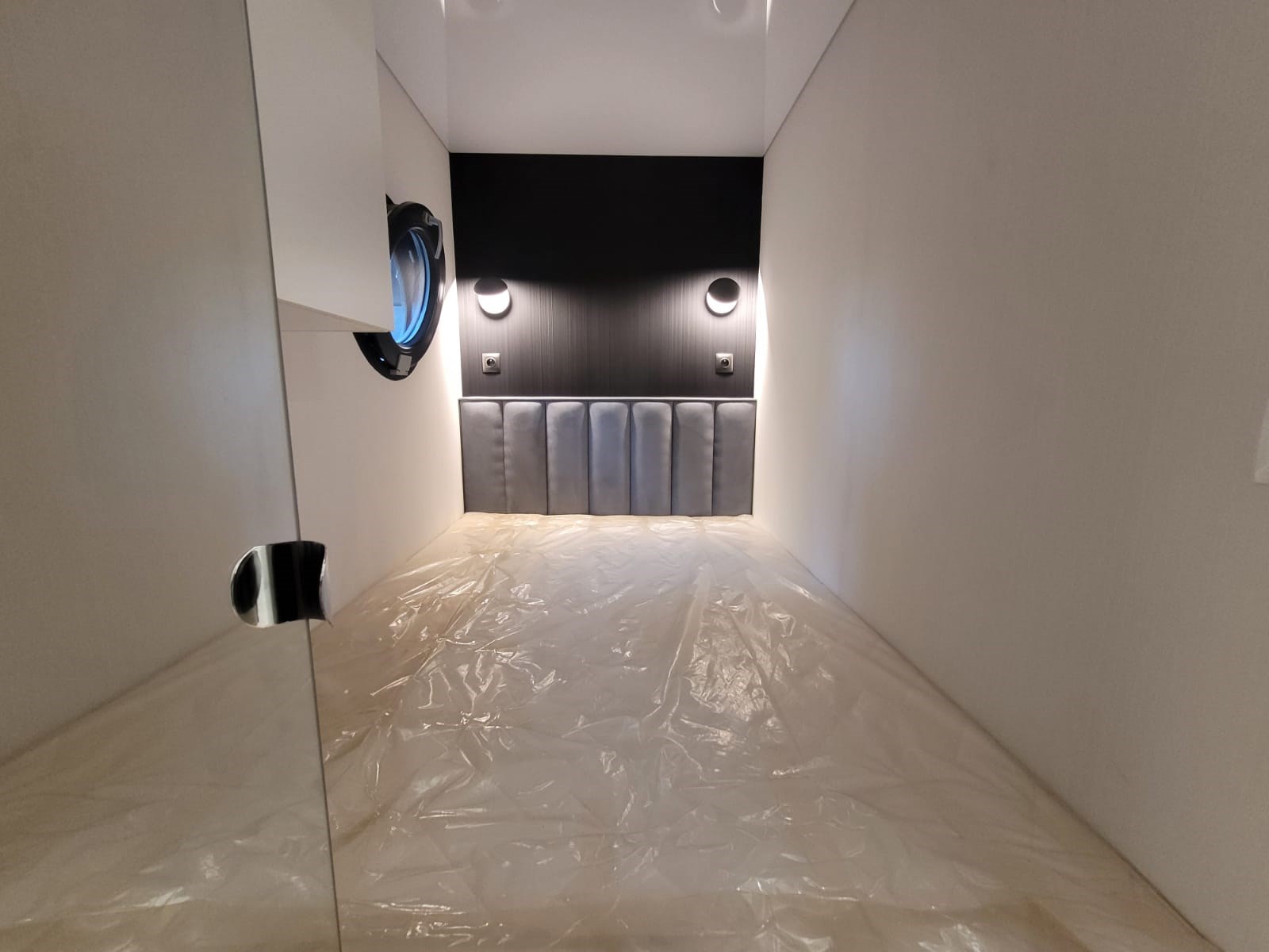 Пол: оцинкованная накладная плита, мембрана, полиуретановая изоляция, водонепроницаемая фанера, напольное покрытие из ПВХ.