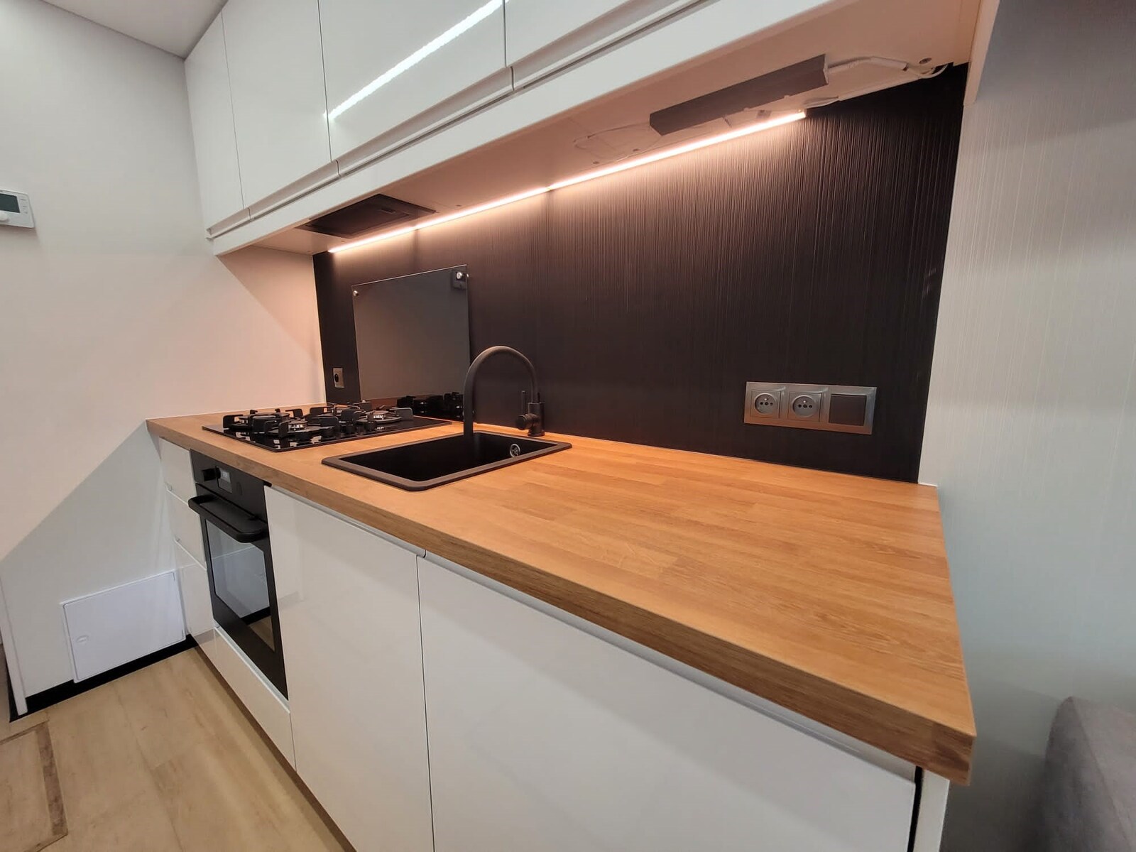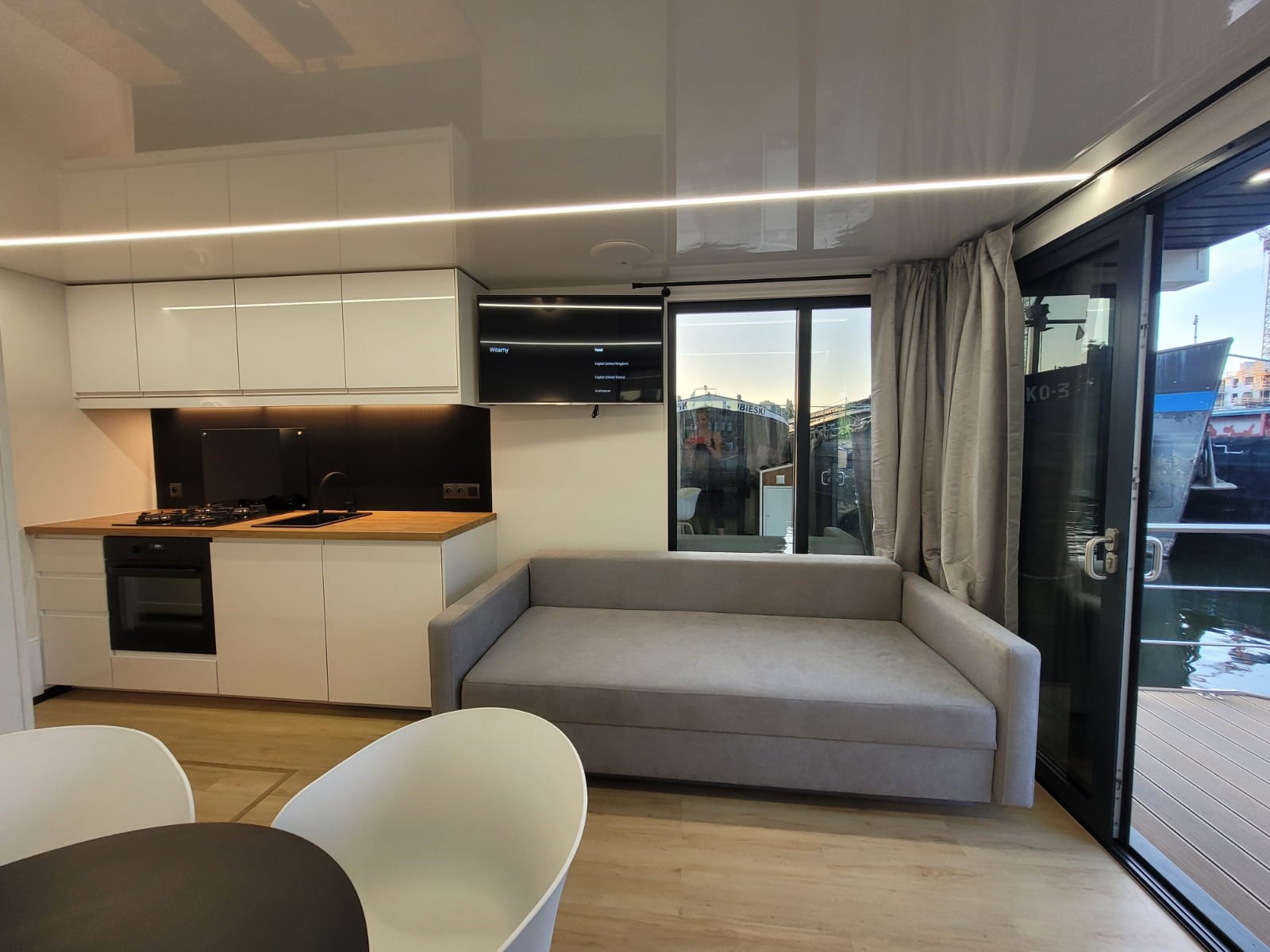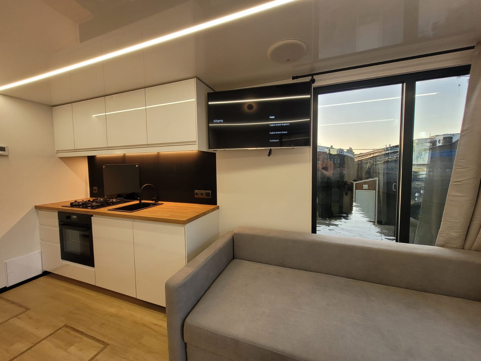 Keuken: ruimte voor kookplaat, afzuigkap, kasten, spoelbak, accu, ruimte voor een koelkast,