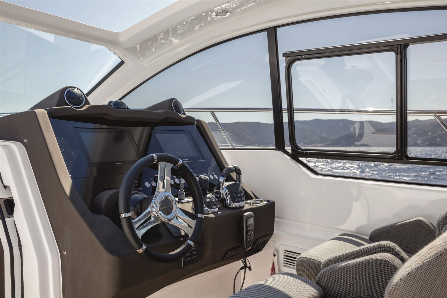 Angolo barra, Comando motori elettronico, Computer di bordo (Volvo), Contametri catena, Contamiglia (Volvo Garmin), Ecoscandaglio (Volvo Garmin), GPS (Garmin), Joystick (Volvo IPS), Pilota automatico (Volvo), 2 Plotter (Volvo Garmin).