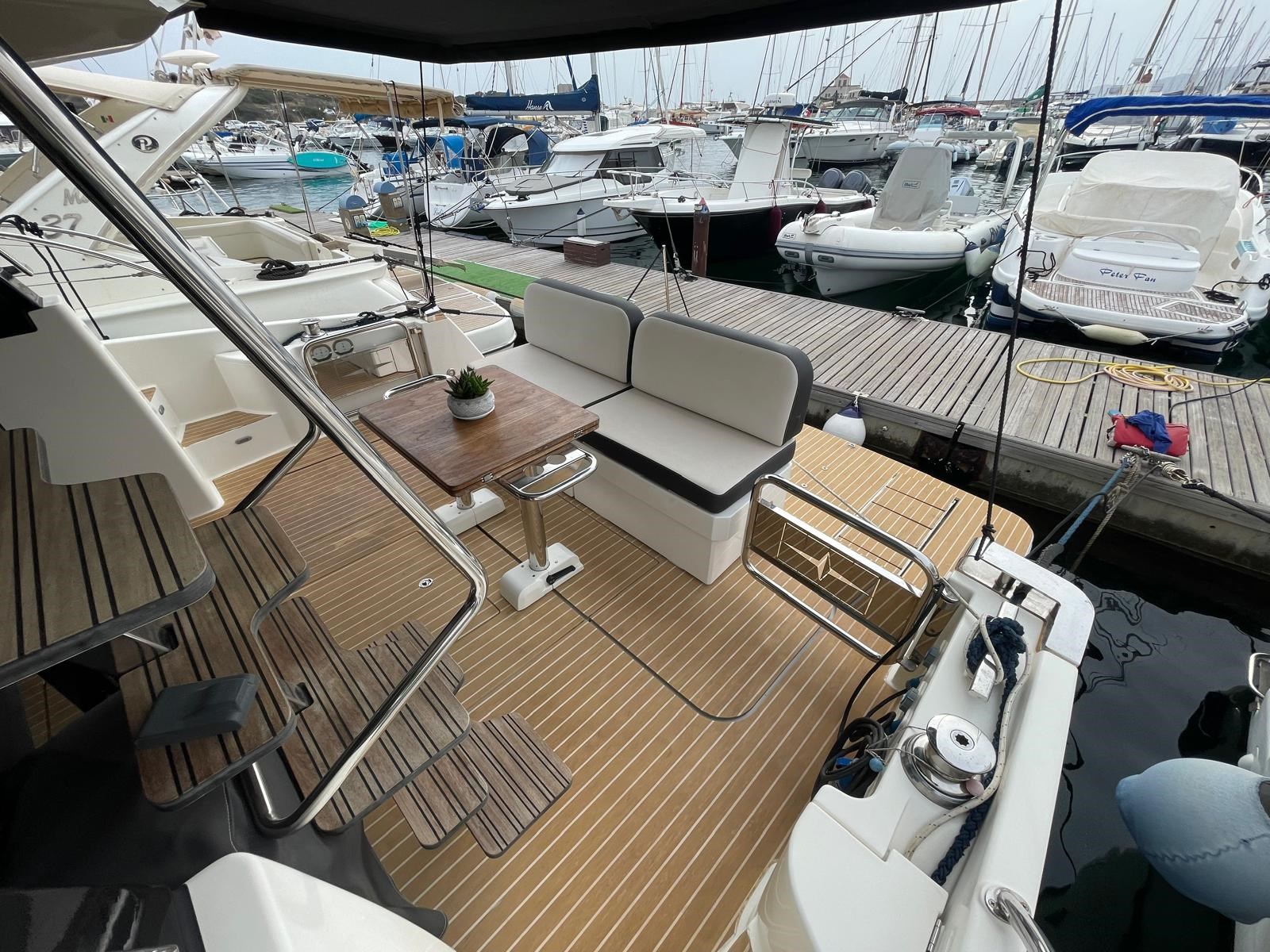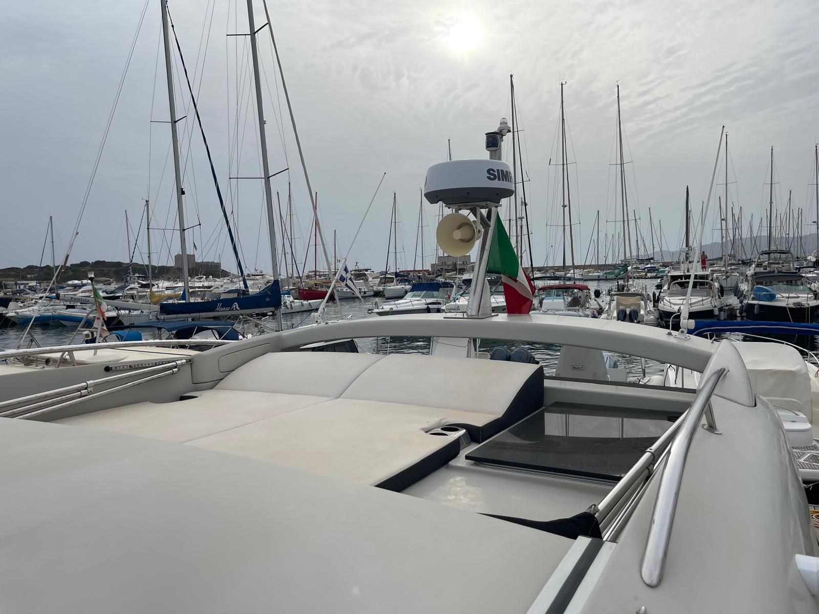 Alarme gaz, 2 Alarme moteur (Volvo), Alarme de pompe de cale, Ouverture du compartiment moteur électrique, Eau sous pression, Trim hydraulique, 6 Batteries, Passavant en teck, Douche de cockpit, Flaps électriques, Garage à annexe, Hard top (apribile elettrico), Extincteur(s) fixe(s), 2 Indicateurs de flaps, Lavage de chaine, Lavabo dans le cockpit, Éclairage de courtoisie (LED), Passerelle, Plateforme arrière, Porte latérale, Cockpit en teck, Prise de quai, Connexion eau sous pression à quai, Guindeau électrique, Echelle de bain, table de cockpit, Table pliante de salon, Annexe (Selva 2,55 fb 5cv), Corne, Winch électrique arrière, Winch électrique avant.