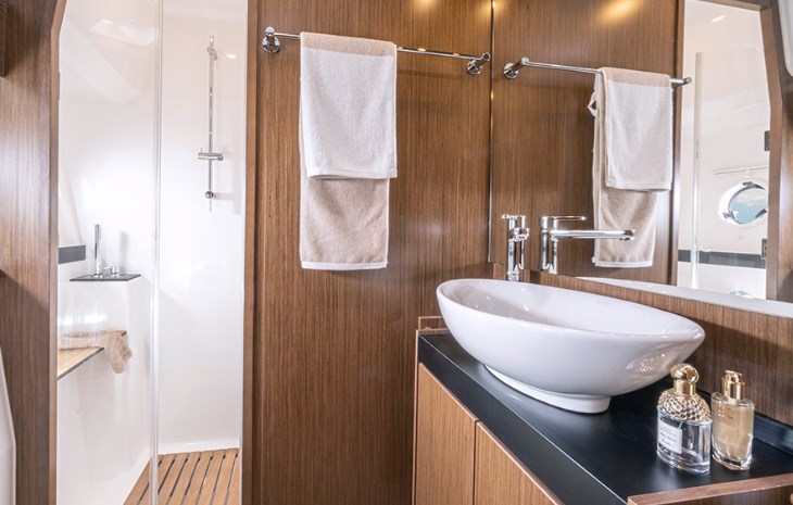 Aire acondicionado (32000 BTU), Calentador (bivalente), Cajafuerte, Climatizador reversible, Atenuador de luz, Suelo interior de madera, Tomas de 12v, Enchufes de 220v, 2 WC marino eléctrico.