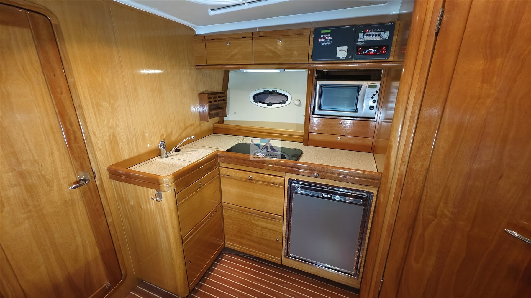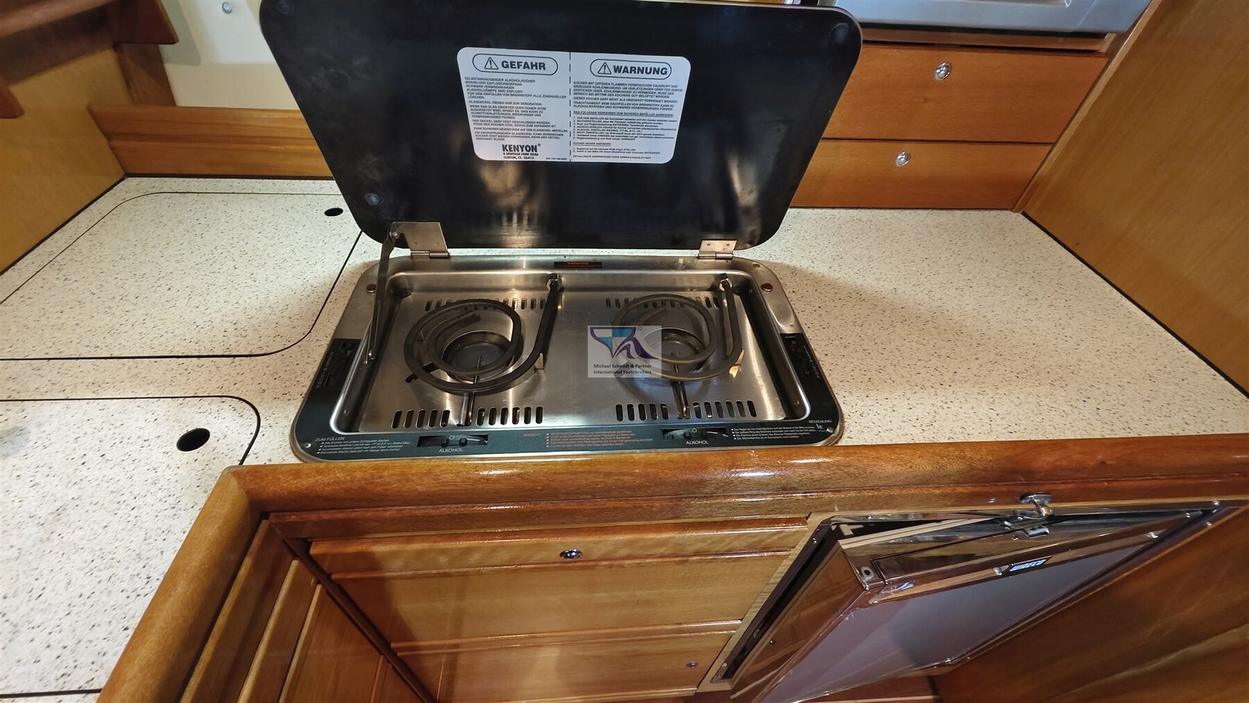 2 Tiefkühlschrank (Kühlfächer in den Kühlschränken), Herd (2-flammig), 2 Kompressor Kühlschrank (Pantry und Cockpit).
