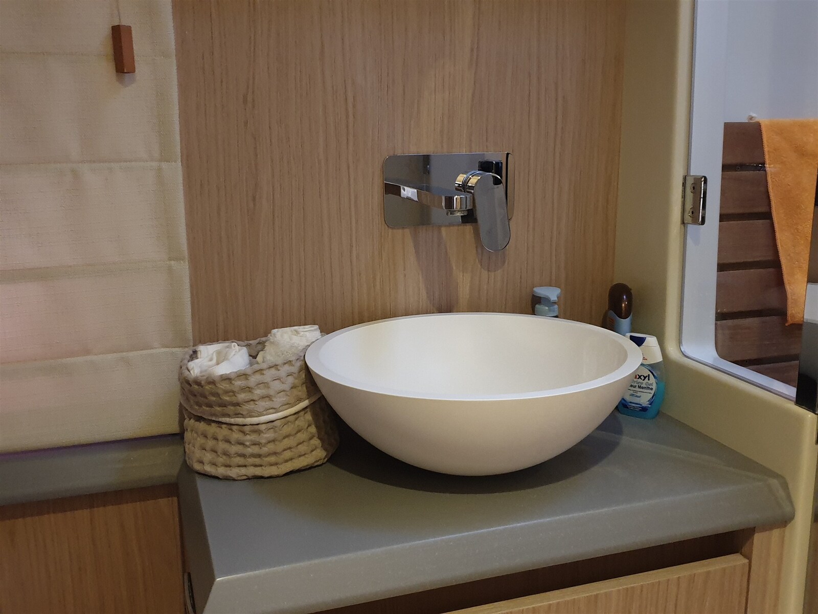 Warmwasserbereiter (60 Litri), Inverter (24 V / 12 V), Innenholzboden, 12V Steckdose, 220V Steckdose, Schwarzwassertank, 3 elektrische Toilette (Vacuflush).