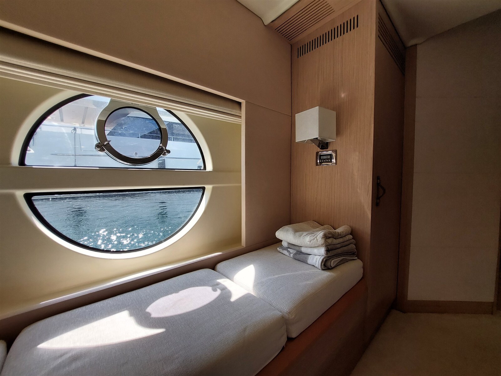 Gas Alarm, 2 Motoralarm, Bilgealarm, Druckwasserpumpe, Cockpitdusche, Doppelsteueranlage, Scheinwerfer am Heck, elektrische Trimmklappen, 2 Trimmklappen Anzeigen, Ketten-Waschanlage, Waschbecken im Cockpit, Nachtbeleuchtung, Gangway, Plattform, automatische Bilgepumpe, 2 elektrische Bilgepumpe, manuelle Bilgepumpe, Eingangstür, Teak im Cockpit, 2 Landanschluß (230 V - 50 Hz 63A con cavo di 15m), Wasseranschluss, elektrische Ankerwinde, Badeleiter, Cockpittisch, Klappbarer Wohnzimmertisch, Beiboot, Signalhorn, Verholwinde auf dem Achterdeck, Verholwinde auf dem Vordeck.