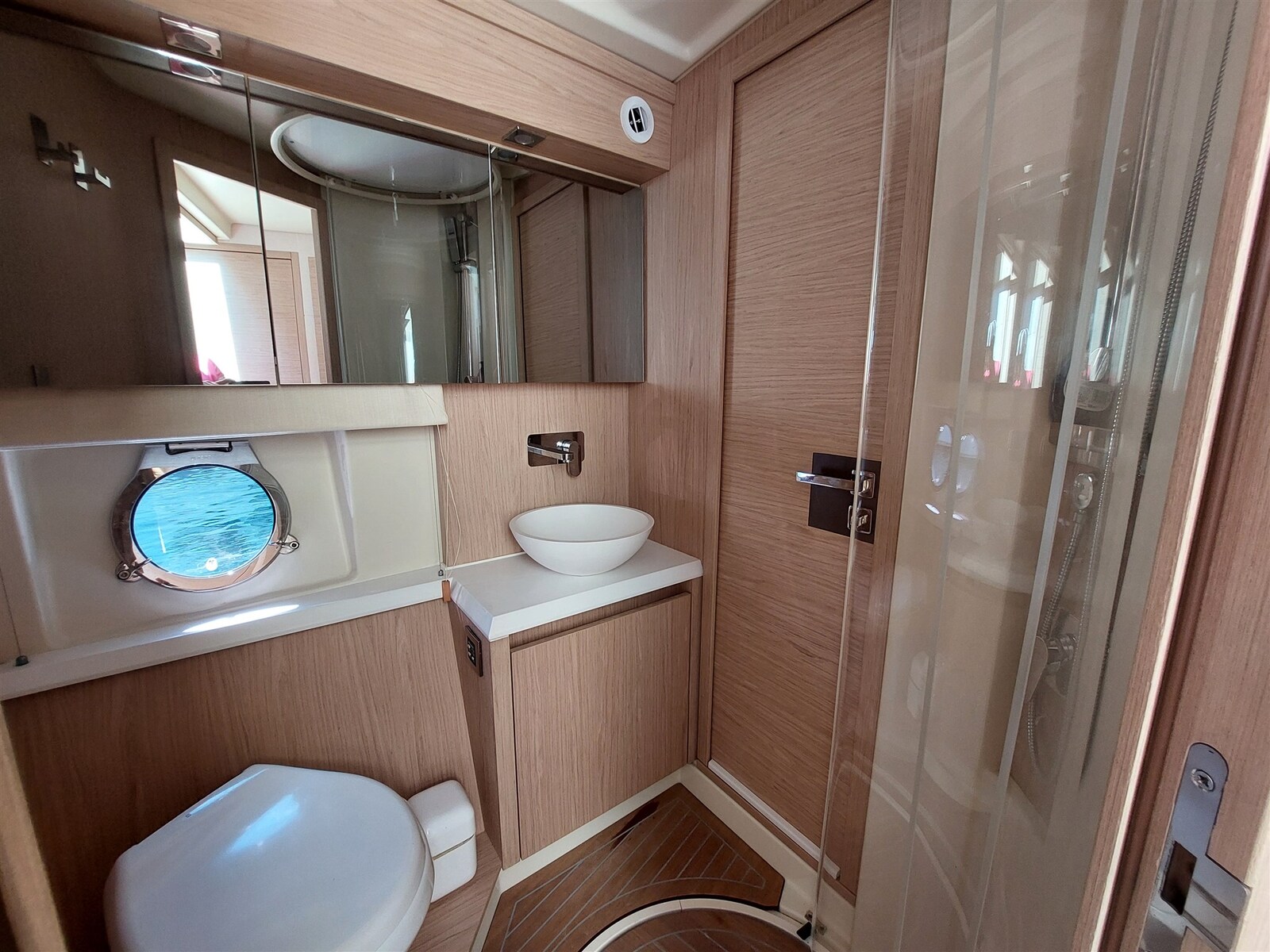 Boiler (60 Litri), Inverter (24 V / 12 V), Pavimento interno in legno, Prese interne 12v, Prese interne 220v, Serbatoio Acque Nere, 3 WC marino elettrico (Vacuflush).