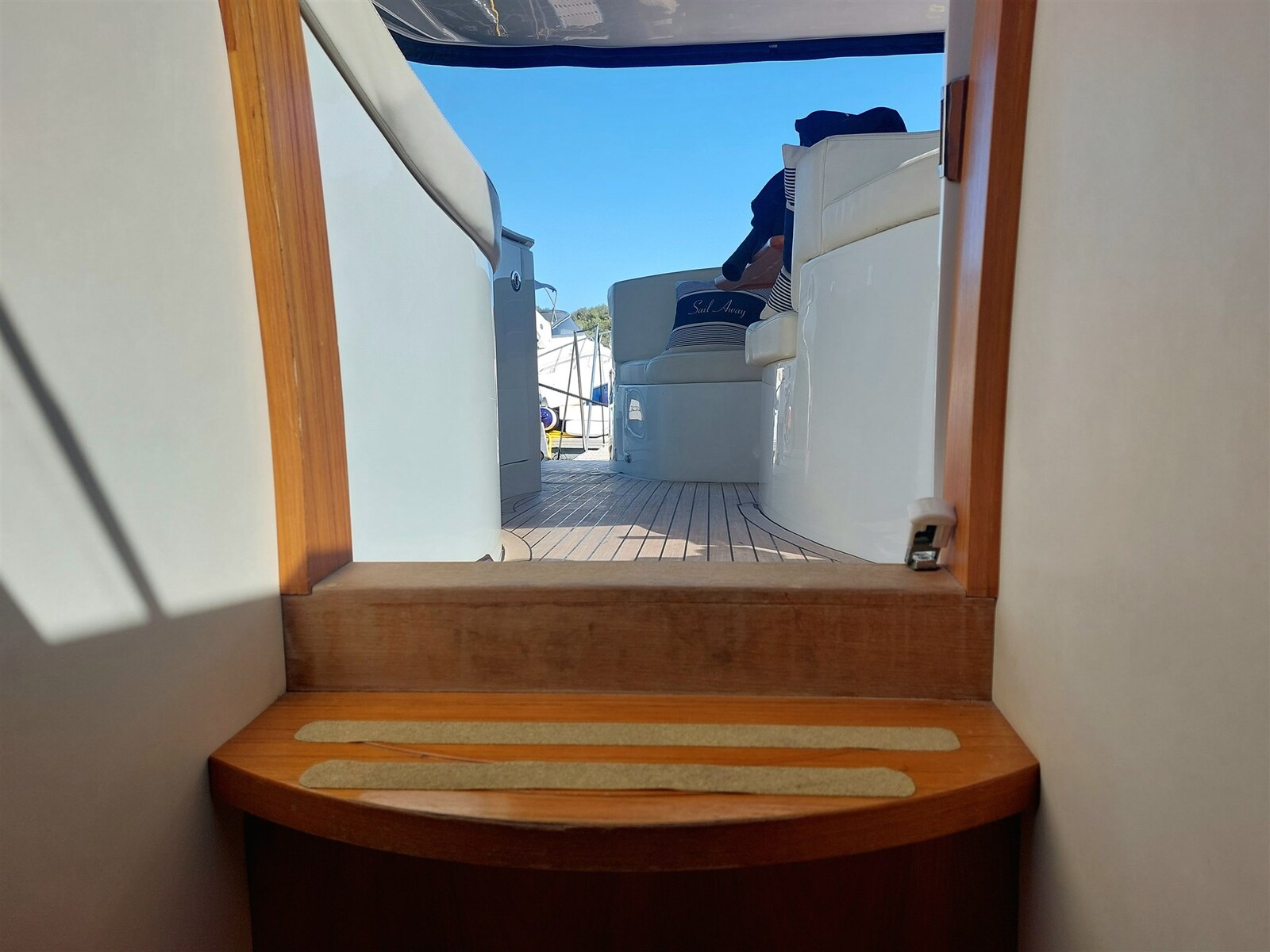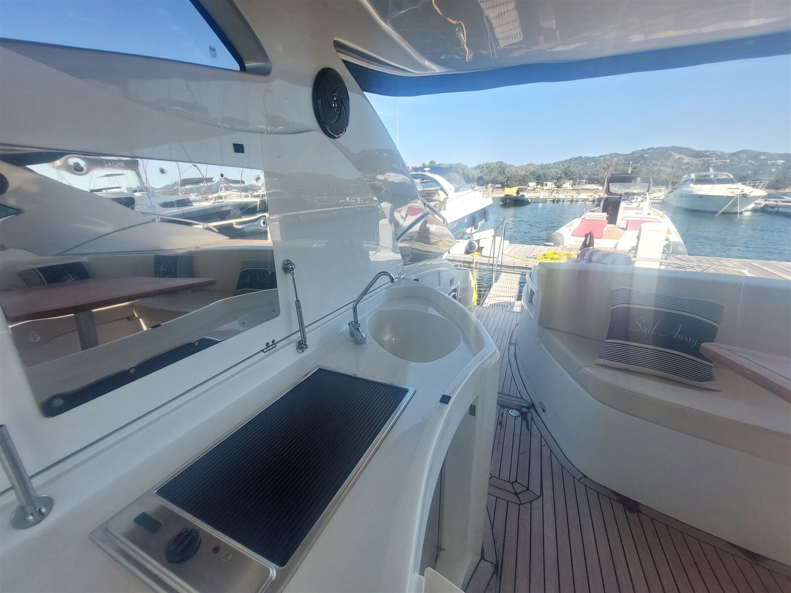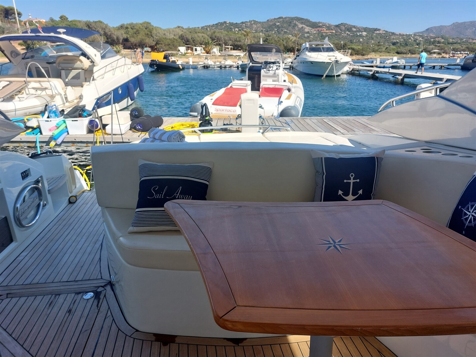 Engine Alarm, Bilge Alarm, Electric Engine Compartment Opening, Water pressure pump, 5 Batteries, Special Colour, Deck Shower, Electric Flaps, Tender Garage, Tender Crane, Hard top, Flaps Indicators, Anchor Chain Washdown, Washbasin in the cockpit, Courtesy Lights, Underwater lights, Gangway, Platform, Automatic Bilge Pump, Entry door, Teak Cockpit, Shorepower connector, Rollbar, Electric Windlass, swimming ladder, cockpit table, Living Room Foldable Table, Tender (CM Mercury 8cv), guard rails with gates, Horn, T-Top, Bow Winches.