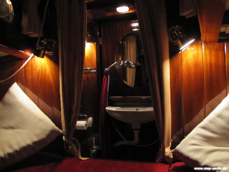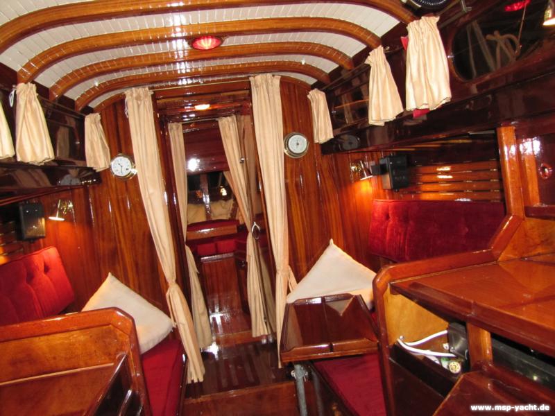 Sie verfügt über eine gemütliche Kajüte in Stehhöhe mit eleganter Innenausstattung, Pantry und abgetrenntem Vorschiff mit WC Bereich.