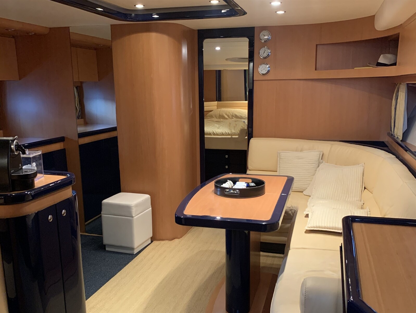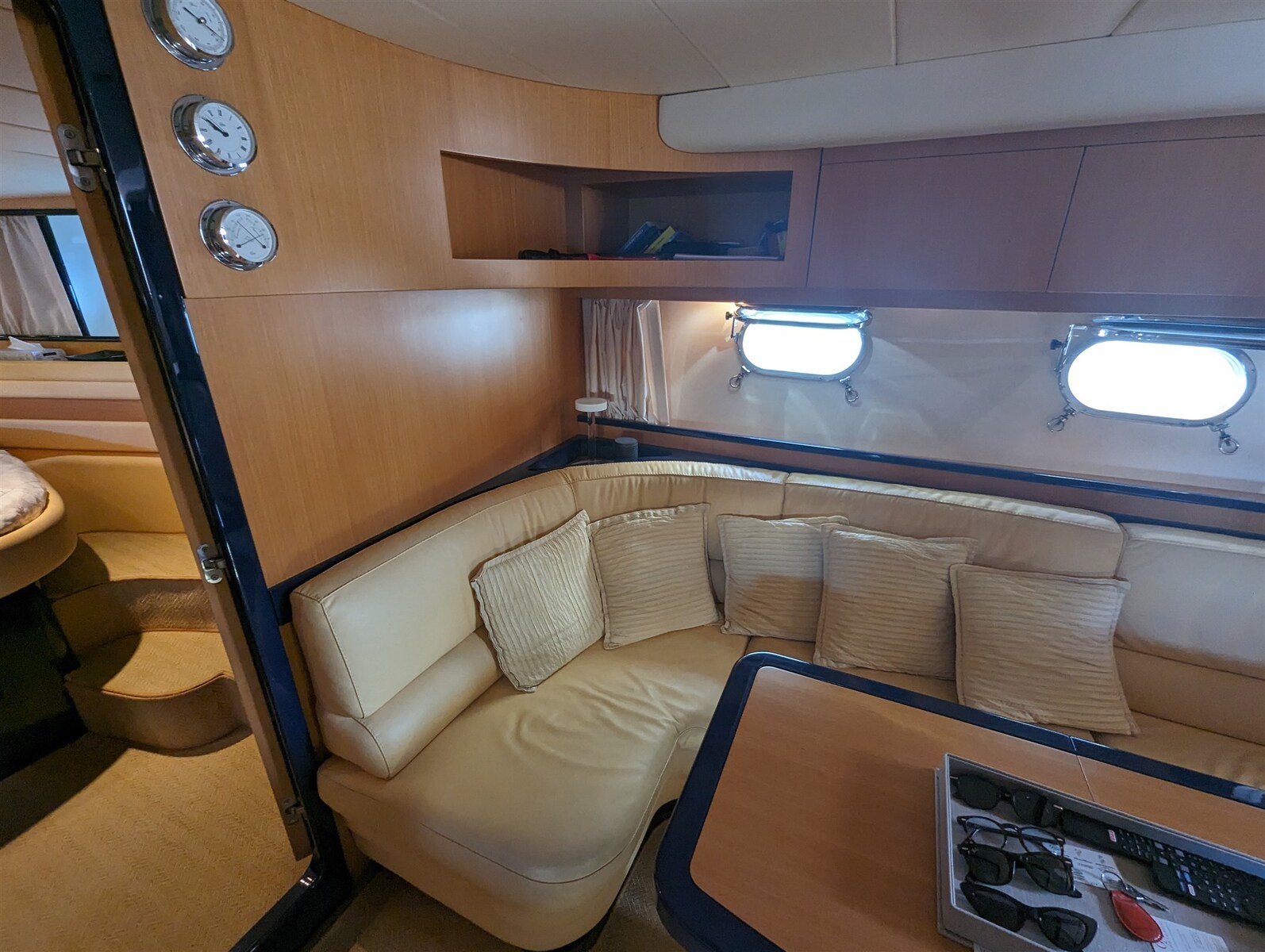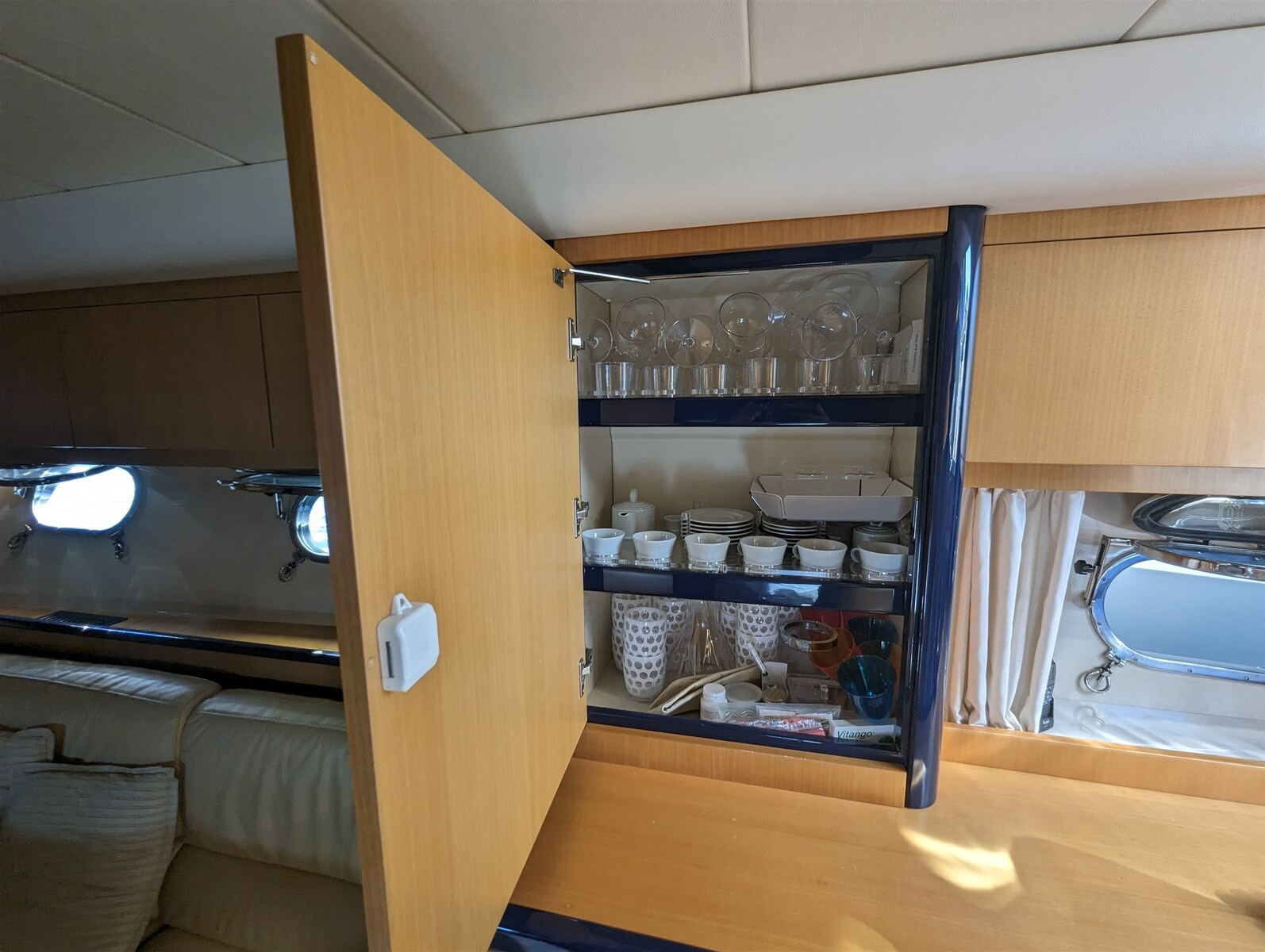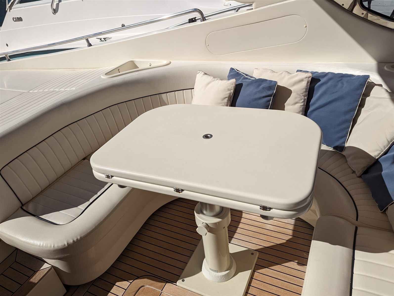 2 Motor Alarm, Bilge Alarm, Waterdruk systeem, Speciale kleur (Blu Sarnico), Buitendouche, Zoeklicht geïnstalleerd op spiegel, Verstelbaar zoeklicht, Brandblussysteem, Trimflappen indicatoren, Anker (ketting) spoelsysteem, Wasbak in de kuip, Sfeerverlichting, Loopplank (Idraulica), Platform (con piano in teak), 4 Automatische bilgepomp, Ingangsdeur, Teak in kuip, Walaansluiting 230V, Gelijkrichter, Rolbeugel, Elektrische ankerlier, Zwemtrap, Kuiptafel, Opklapbare salontafel, Hoorn, Hek lier, Boeglier.