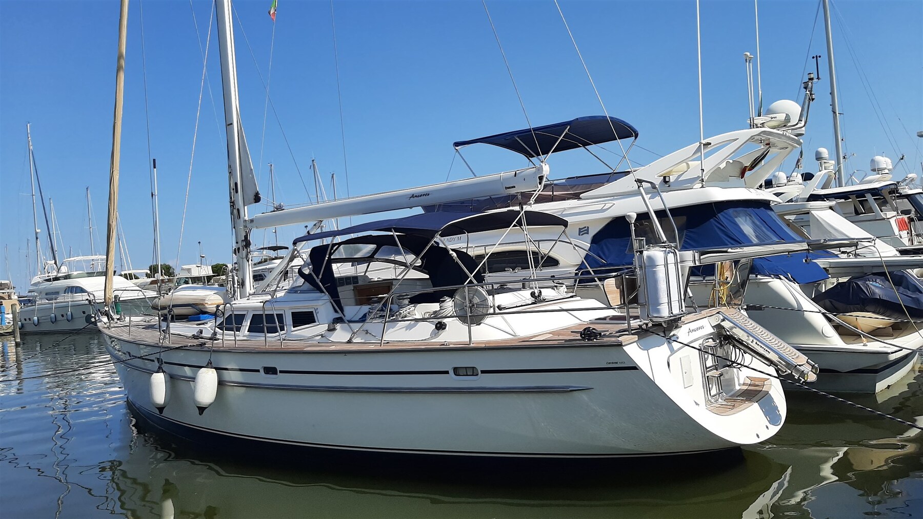 Bottazzo in legno con listello in inox, riflettore radar CYCLOPS II, strobe light e luce tricolore in testa d'albero, tutti oblò con oscuranti e zanzariere, elica 3 pale GORI, estrattore fumi in cuccina,