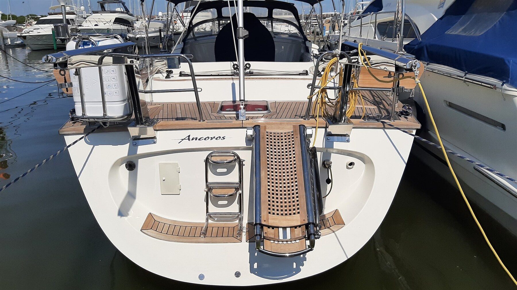 Allarme motore, Ancora (ULTRA Inox), Autoclave, Batterie (2026), Caricabatterie (MASTERVOLT Kombi 24V/4000W/60A), Doccia esterna (h/c), Elica di prua - bow thruster (SLEIPNER 24V, 10 hp, 25 cm), Gruette (SIMPSON 100), Gruette per motore fuoribordo (NOVALIFT), Luci di cortesia, Passerella (BESENZONI 2,35 m hydr), Pompa di sentina automatica, Pompa di sentina manuale, Ponte in teak (2025 new), Presa 220V banchina, Salpa Ancore Elettrico (+ Capstan, 100 m ss chain), Sartiame spiroidale (2025 new), Scaletta da bagno, Supporto motore fuoribordo (in stern locker), Tavolo pozzetto (Teak, with extension), Tender (WILLIAMS Jet 60 hp 10h), Tientibene con cancelletti, Tromba, Winch Elettrico (2 x LEWMAR 48 + 2 x LEWMAR 64), Windex.