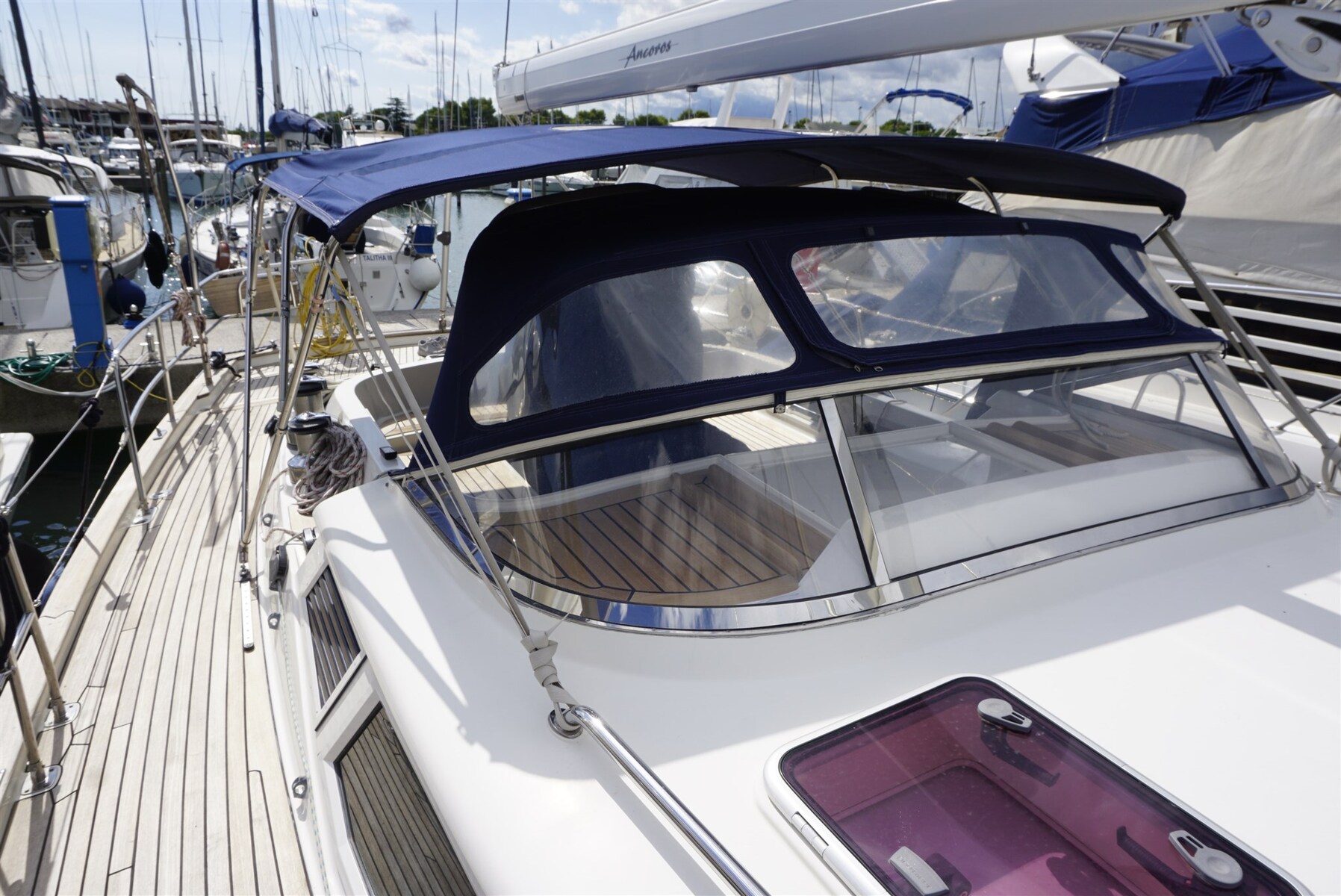 Bimini (2026), Capota antirrociones (2026 + fixed glass screen), Funda del barco (winter + summer cover 2025), Cojinería bañera.