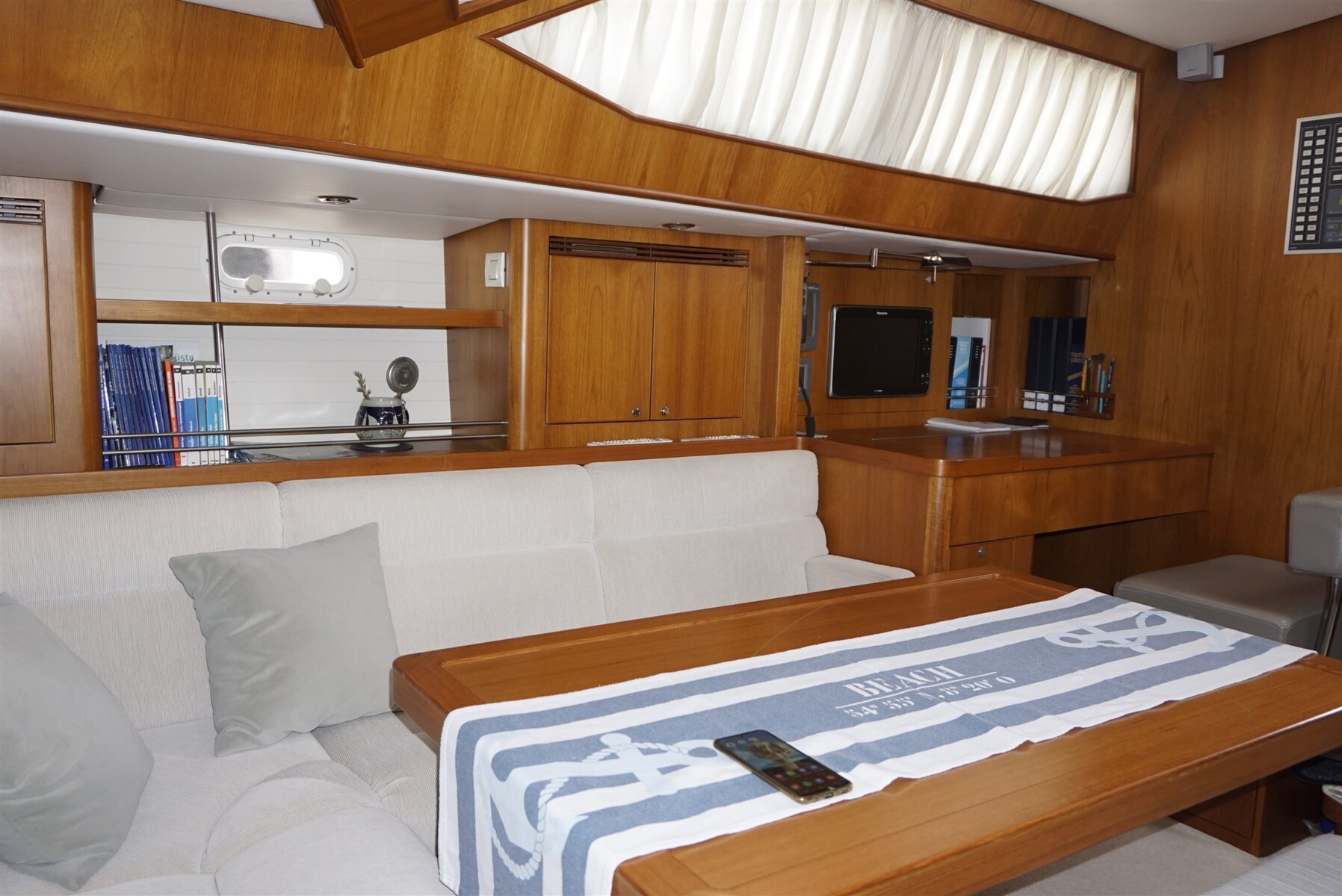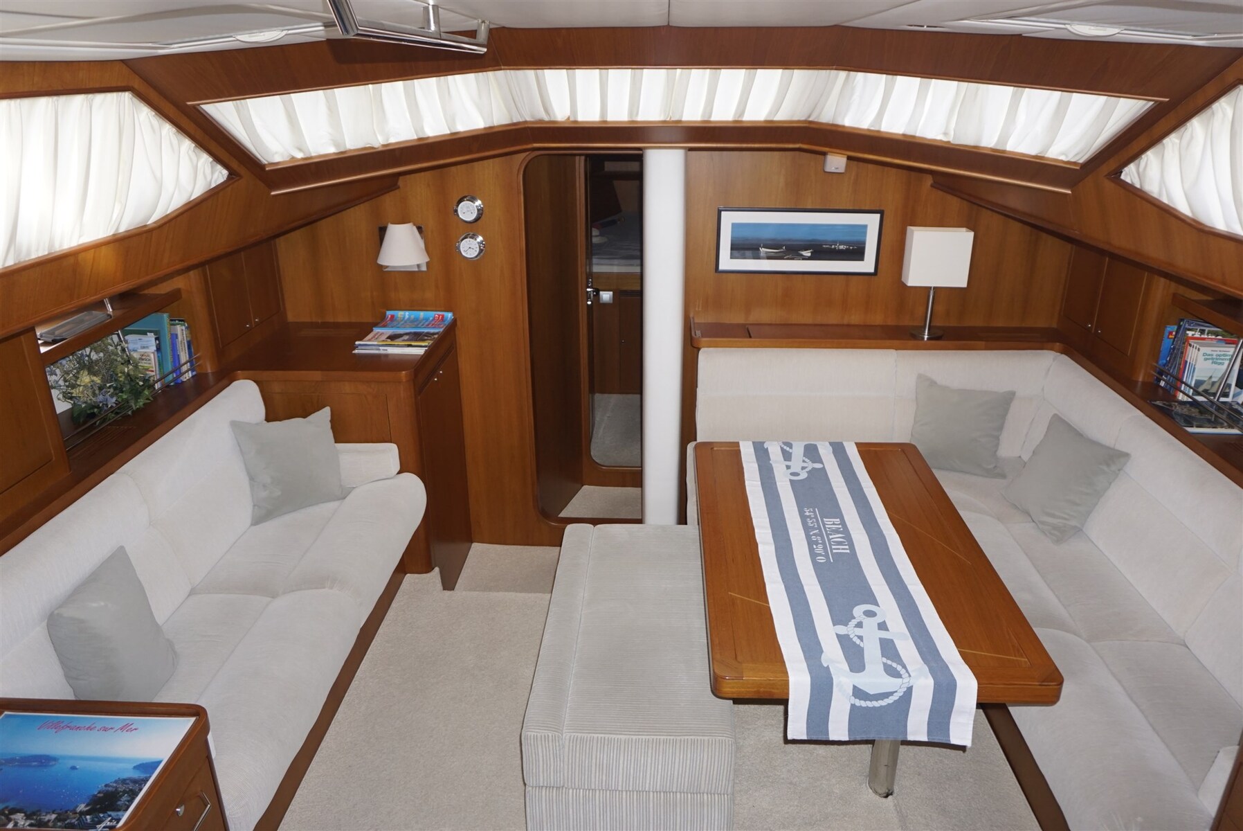 Teak rubbing strake with stainless steel strip, CYCLOPS II radar reflector, strobe light and tricolor light at mast top, all portholes with blinds and mosquito nets, 3-blade GORI propeller, fume extractor in galley,