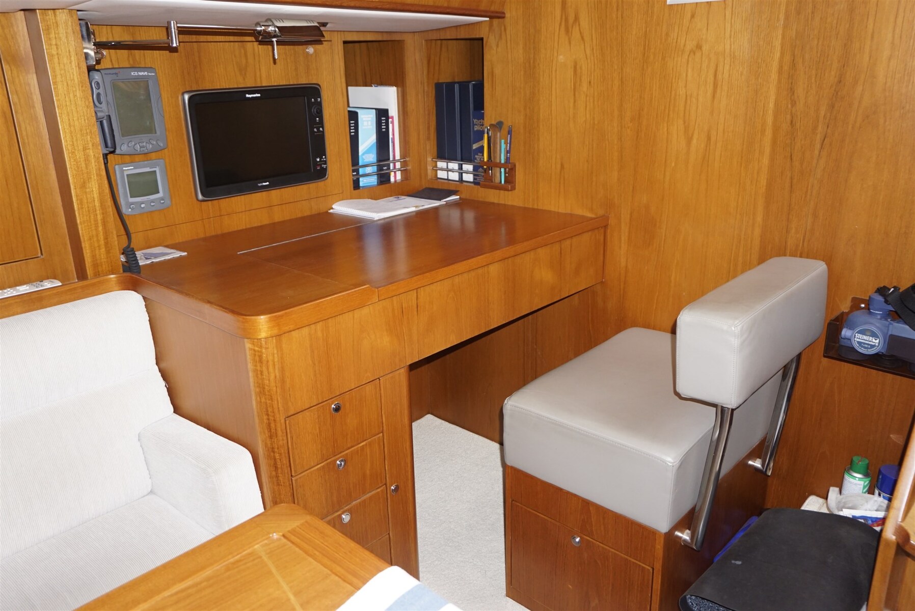 AIS (2025), Roerhoek indicator, Radar antenne (RAYMARINE), Log (RAYMARINE ST60+), Beeldscherm (RAYMARINE ST60+ charttable and owner's cabin), DSC marifoon (RAYMARINE), Dieptemeter (RAYMARINE ST60+), EPIRB (2025), GPS (RAYMARINE), Log (RAYMARINE ST60+), Navtex (weerschrijver) (Navtex ICS Nav 6a), Autopiloot (RAYMARINE ST7001+ and remote control), Kaartplotter (RAYMARINE E120 + E80), Radar (RAYMARINE), Windmeter (RAYMARINE ST60+).