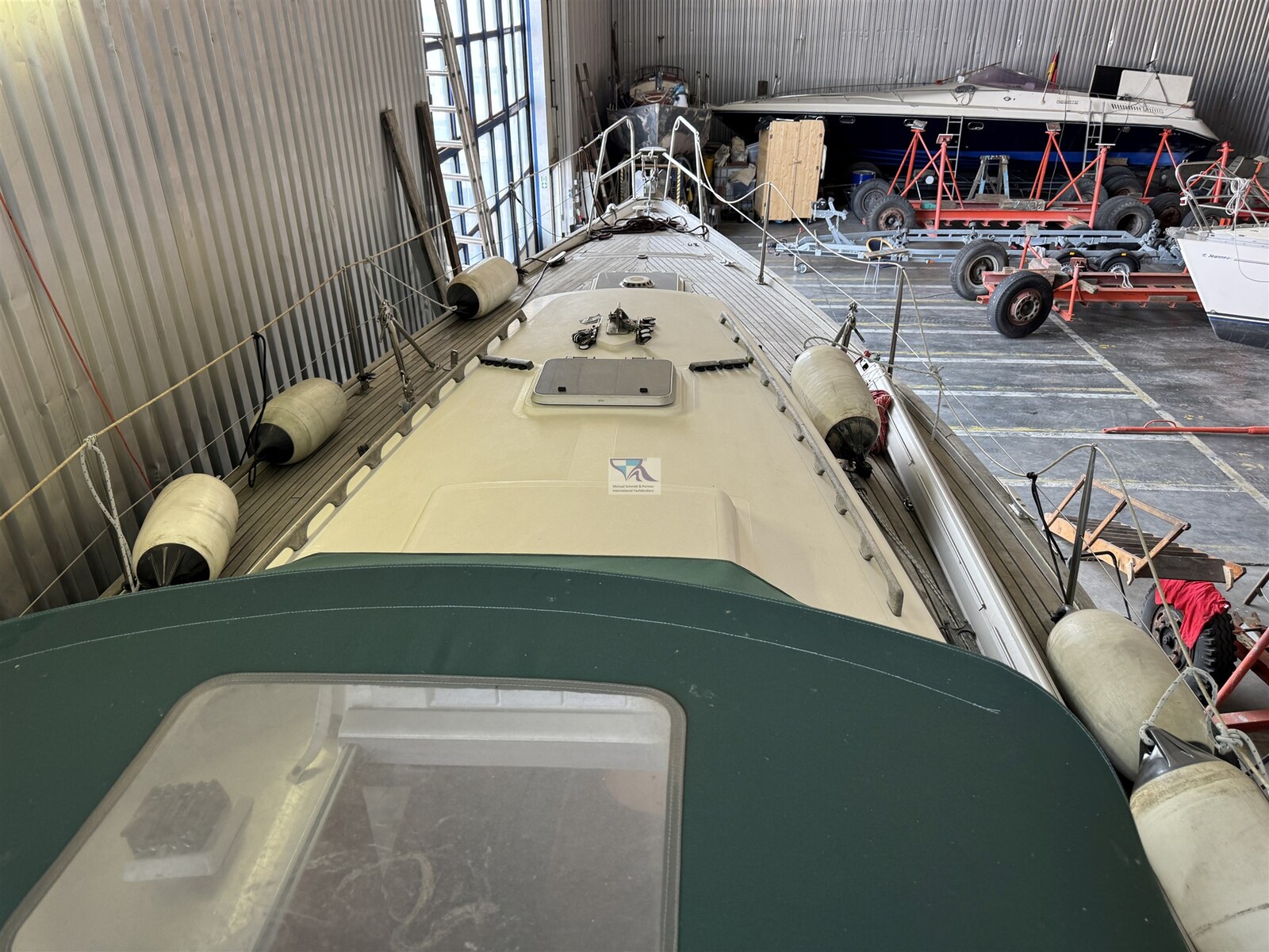 Anchor (Delta), Electric cable reel, 3 Batteries (Vetus, insgesamt 330 Ah), Teak Side Decks, Battery charger (Victron 25A), Manual Bilge Pump, Teak Cockpit, Shorepower connector, Water harbor connector system, Electric Windlass (Maxwell vert.Ankerwinde mit Spill, RC10-8), swimming ladder, cockpit table, 2 guard rails with gates, Teak Deckhouse, Bow Winches, Windex.