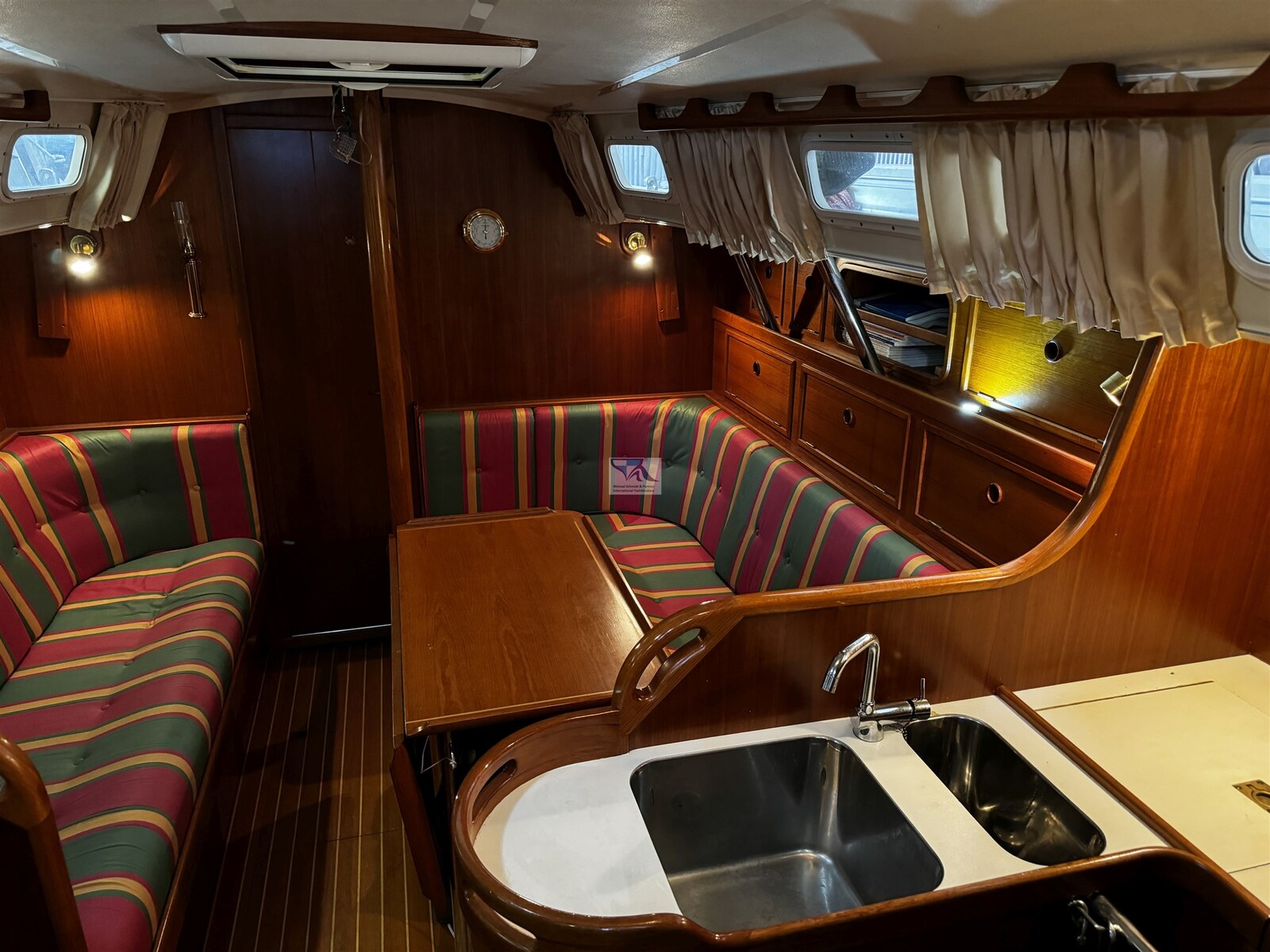 Ancla (Delta), Enrollador electrico de la toma de tierra, 3 Baterías (Vetus, insgesamt 330 Ah), Pasillos laterales en teca, Cargador de batería (Victron 25A), Bomba de achique manual, Bañera en teca, Toma de 220V para el puerto, Toma de agua para el puerto, Molinete eléctrico (Maxwell vert.Ankerwinde mit Spill, RC10-8), Escalera de baño, mesa de bañera, 2 Guardamancebos con entradas, Cubierta interior en teca, Cabrestantes de proa, Windex.