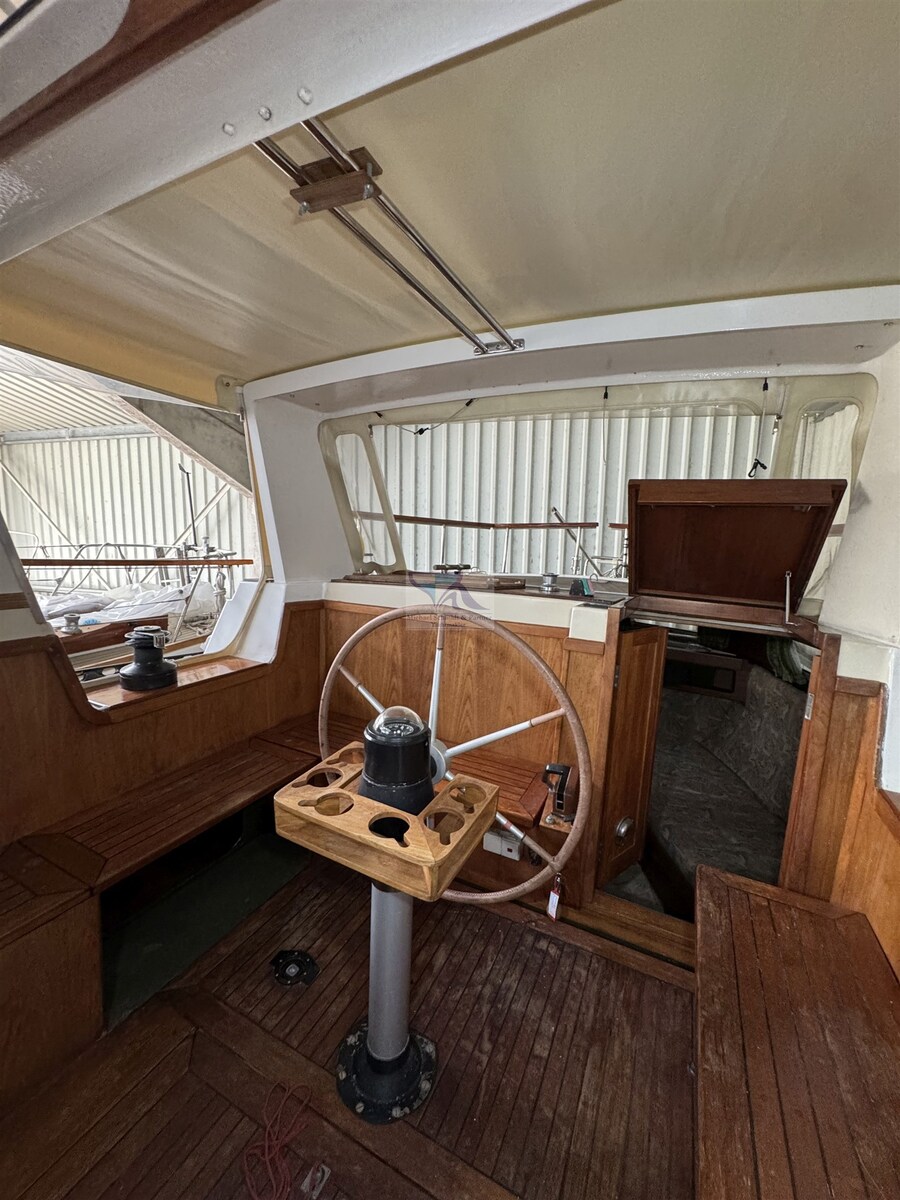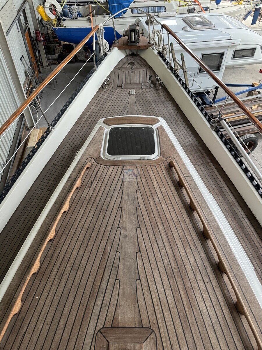 Robust motor sailer of Paul Elvström with lead keel, strong Volvo Penta diesel (68hp) and large deckhouse.