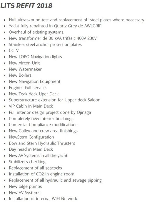 Prueba de ultrasonidos del casco y reemplazo de las placas de acero cuando fue necesario. Yate completamente repintado en gris cuarzo de AWLGRIP. Revisión de los sistemas existentes. Nuevo transformador de 30 kVA trifásico 400V 230V. Placas de protección de acero inoxidable para el ancla. CCTV. Nuevas luces de navegación LOPO. Nueva unidad de aire acondicionado. Nuevo desalinizador. Nuevas calderas. Nuevo equipo de navegación. Servicio completo de los motores. Nueva cubierta de teca en la cubierta superior. Extensión de la superestructura para el salón de la cubierta superior. Cabina VIP en la cubierta principal. Proyecto de diseño interior completo realizado por Ojinaga. Acabados interiores completamente nuevos. Modificaciones para el cumplimiento comercial. Nueva cocina y acabados de la zona de la tripulación. Nueva configuración de la popa. Propulsores hidráulicos de proa y popa. Baño de día en la cubierta principal. Nuevos sistemas de AV en todo el yate. Verificación de estabilizadores. Reemplazo de todas las válvulas. Instalación de CO2 en la sala de máquinas. Reemplazo de todas las tuberías hidráulicas y de aguas residuales. Nuevas bombas de sentina. Nuevos sistemas de AV. Instalación de WIFI interno.