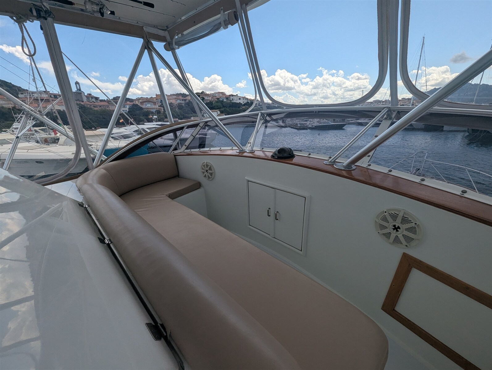 Alarme gaz, 2 Alarme moteur, Alarme de pompe de cale, Alternateur, Eau sous pression, Douche de cockpit, Phares fixes arrière, Flaps hydrauliques, Hard top (con trasparenti laterali), Extincteur(s) fixe(s), Lavabo dans le cockpit, Éclairage de courtoisie, Spots sous-marins, Passerelle (Manuale), Plateforme arrière, 4 Pompe de cale automatique, Porte latérale, Cockpit en teck, Prise de quai, Connexion eau sous pression à quai, Onduleur, Guindeau électrique, Echelle de bain, table de cockpit, Corne.