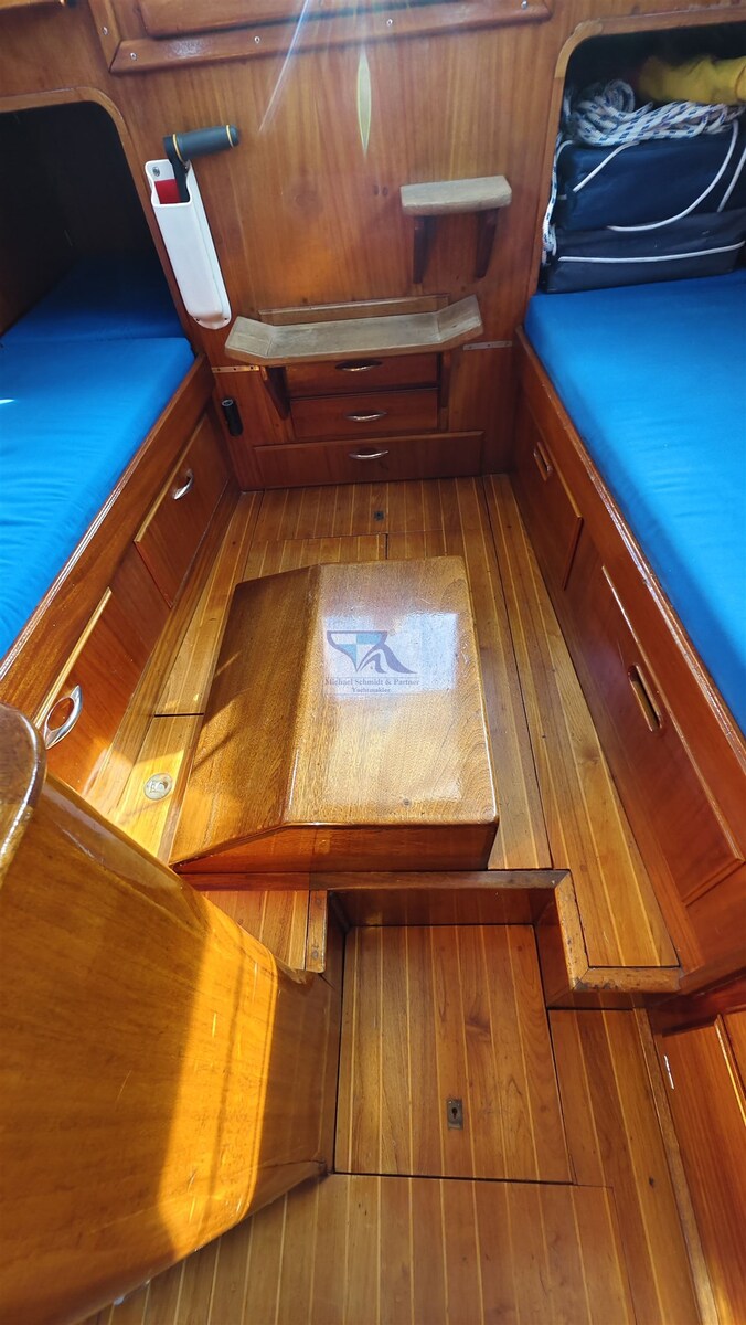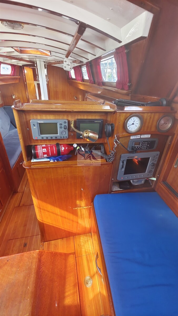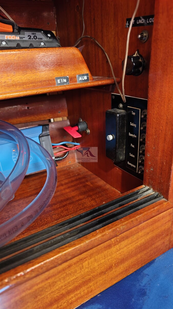 Anchor (mit ca. 20 m Kette), Water pressure pump, 3 Batteries (1 Starter und 2 x 80 AH Service), Teak Side Decks, Battery charger (VICTRON), Teak Cockpit, Shorepower connector, Strand rigging (Rodd-Rigg), 4 Winch (2 x Andersen Edelstahl ST, 2 Lewmar ST), Windex.