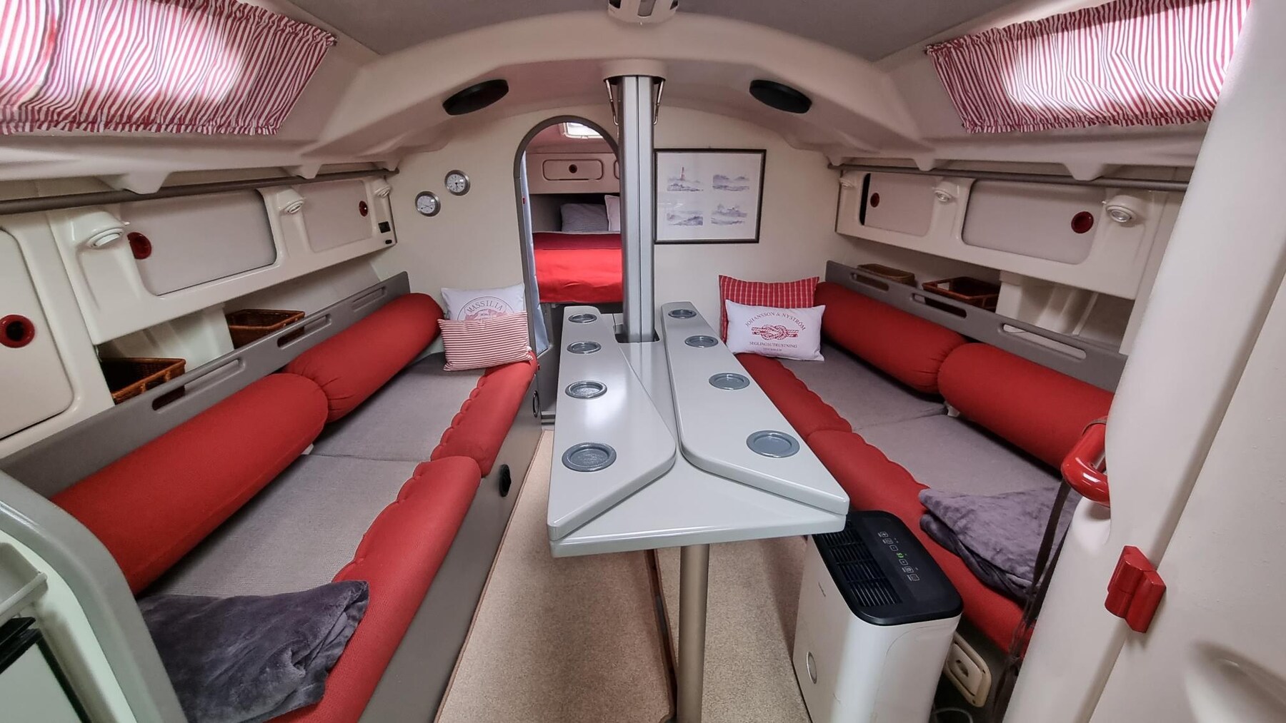 Gennaker equipment, Spi Equipment, Jib Furling System, Ball bearing slider mainsail, Lazy Jack, Sail Bag, Backstay tensioner, Mainsheet traveller, Vang.