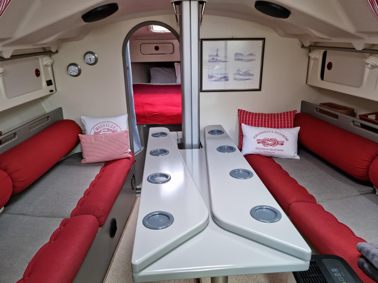 AIS, Compass (Silver), Odometer (B+G), Display (B+G), DSC vhf, 2 Depth Sounder (B+G, unbekannt), Interface (NMEA 2000), Autopilot (Raymarine NMEA 2000), Plotter with GPS antenna (B+G), Wind Station (B+G), Yacht controller.