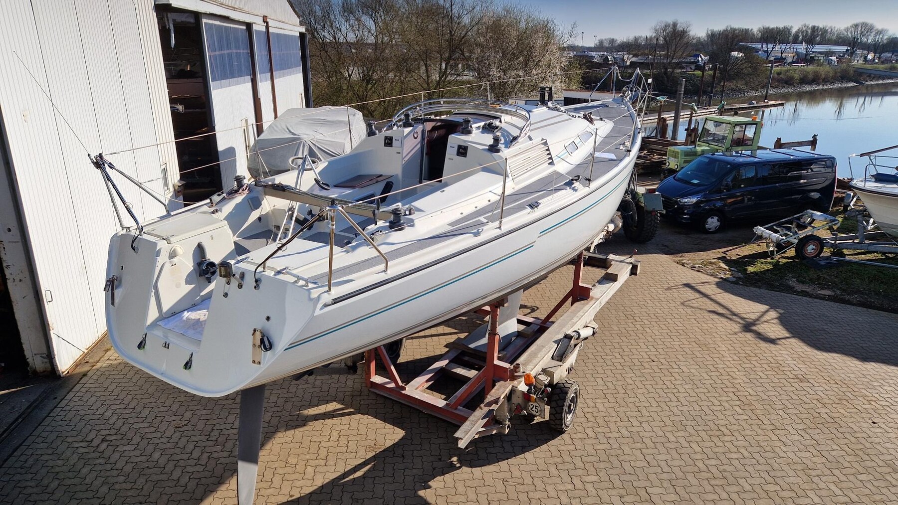 2 Anchor (Racner und Flugchar), Water pressure pump, Electric cable reel, 3 Batteries (2 x 100 Ah, Starter 45 Ah), Battery charger (Vetron), Deck Shower, Fire Extinguishing System, Courtesy Lights (im Salon und Navi), Shorepower connector, 6 Winch, Windex.