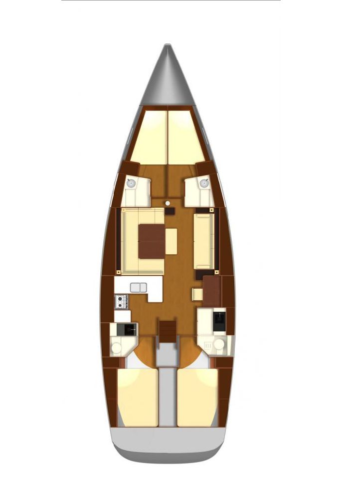 Dufour 485 Grand Large del año 2008, versión con cuatro cabinas dobles y cuatro baños.