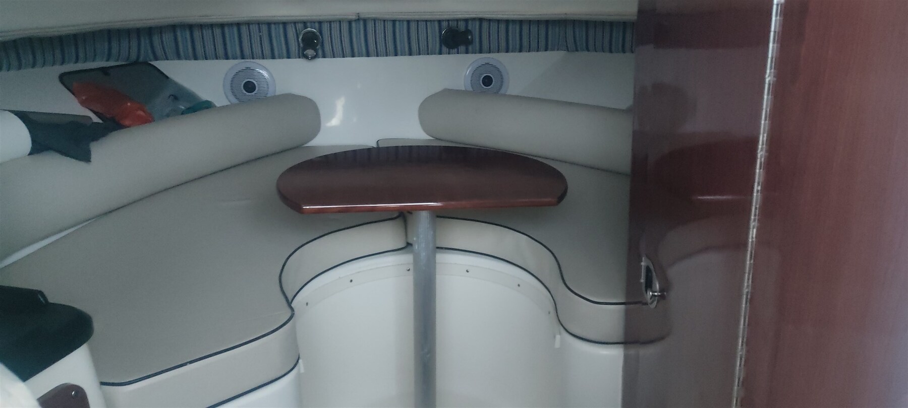 Fume/Gas Detector, 2 Engine Alarm, Bilge Alarm, Water pressure pump, 4 Batteries, Deck Shower, Headlights fixed on the stem, Hydraulic Flaps, Flaps Indicators, Washbasin in the cockpit, Courtesy Lights, Underwater lights (faro di profondità), Entry door, Shorepower connector, Electric Windlass, swimming ladder, Living Room Foldable Table, Horn, T-Top, Bow Winches.
