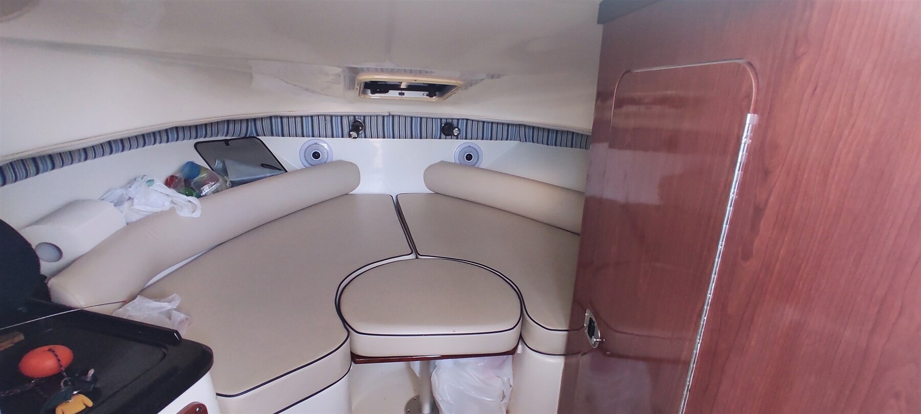 Gas Alarm, 2 Motoralarm, Bilgealarm, Druckwasserpumpe, 4 Batterien, Cockpitdusche, Scheinwerfer am Heck, Trimmklappen hydraulisch, Trimmklappen Anzeigen, Waschbecken im Cockpit, Nachtbeleuchtung, Unterwasserbeleuchtung (faro di profondità), Eingangstür, Landanschluß, elektrische Ankerwinde, Badeleiter, Klappbarer Wohnzimmertisch, Signalhorn, T-Top, Verholwinde auf dem Vordeck.