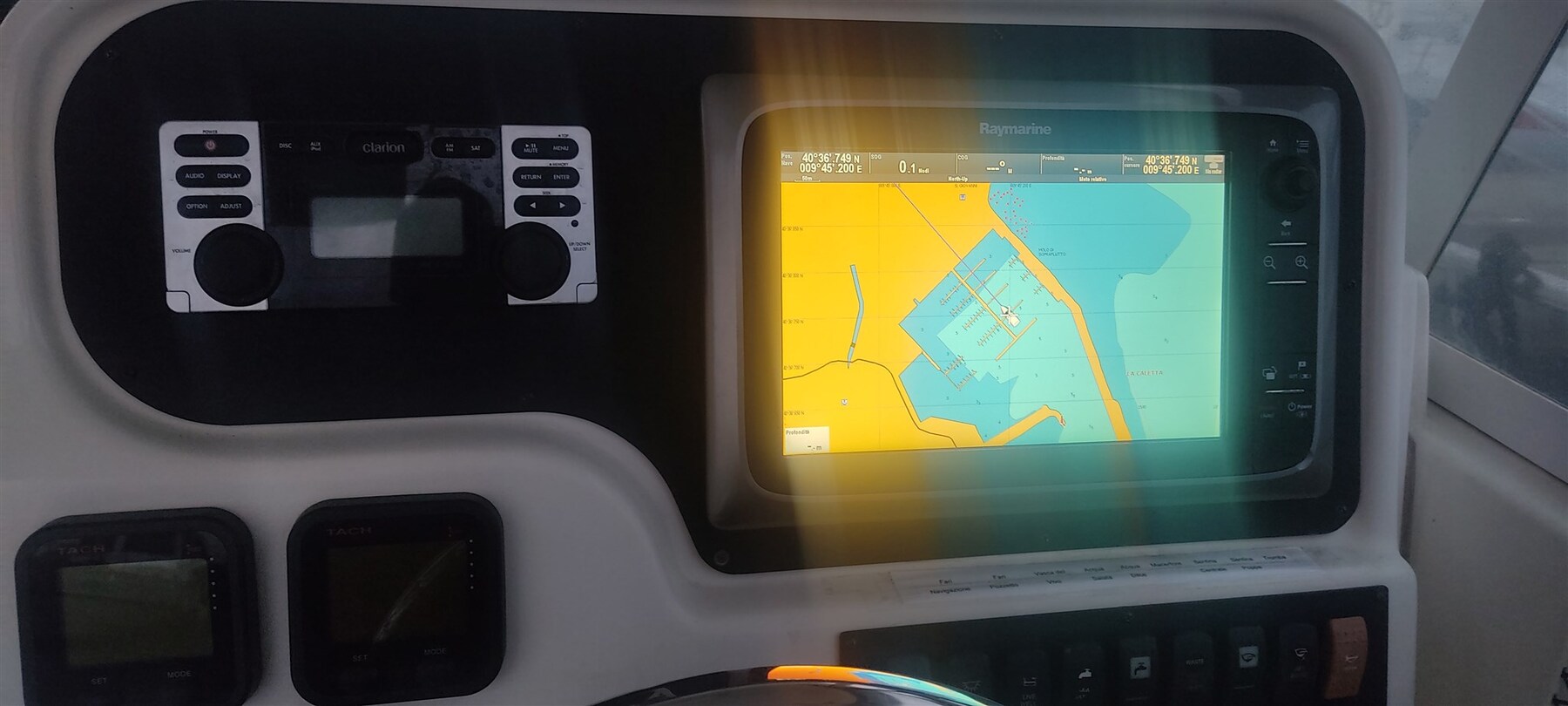 Antenna radar (Raymarine), Comando motori elettronico, Computer di bordo, Contametri catena, Ecoscandaglio (Raymarine), Pilota automatico (Raymarine), Plotter con antenna GPS (Raymarine).