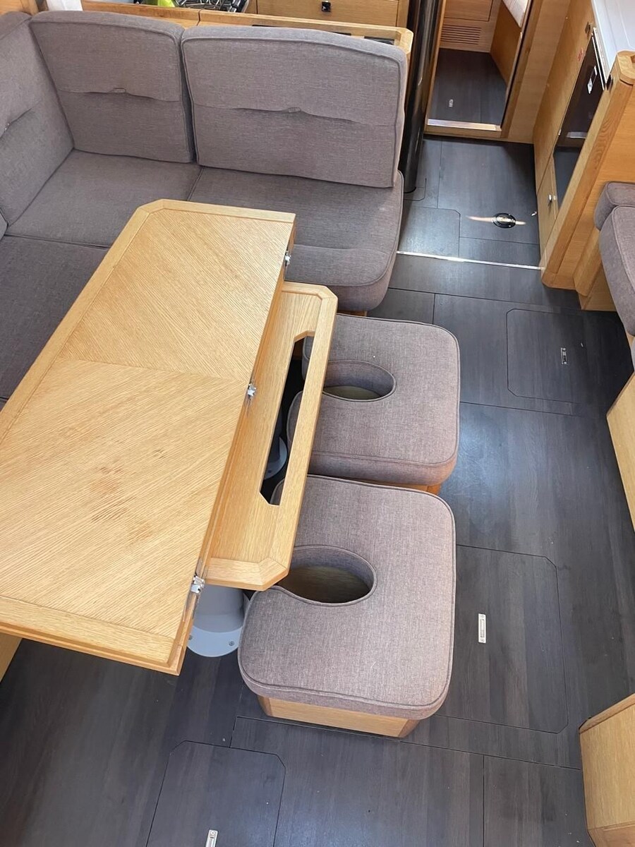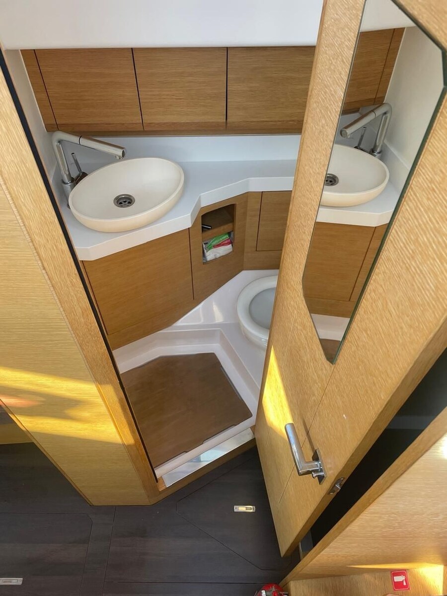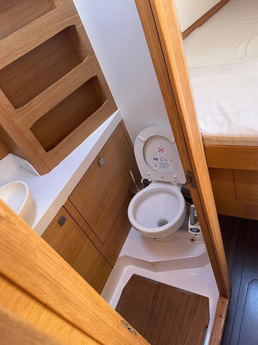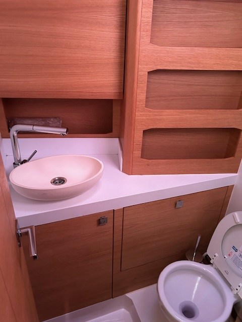 Anchor (Delta mit 60m verzinkter Kette), 2 Batteries (aus 2024), Bow Thruster (ausfahrbar inkl. 2 Batterien und Ladegerät), Courtesy Lights (und Deckslicht), Battery Monitor, Gangway, Manual Bilge Pump, Electric Windlass (Lewmar, 1000W mit zusätzlicher Batterie), cockpit table (upgrade, nicht standard), 2 guard rails with gates.