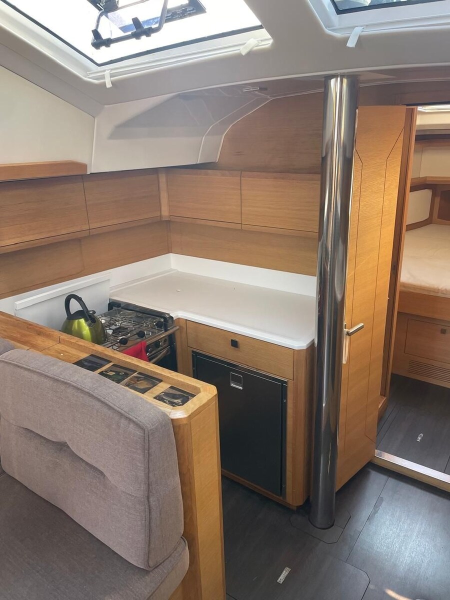 Het nieuw ontworpen interieur biedt een verhoogd niveau (semi-dek salon), een kombuis aan de voorkant van het hoofdschot en meer ruimte in de kajuiten.
