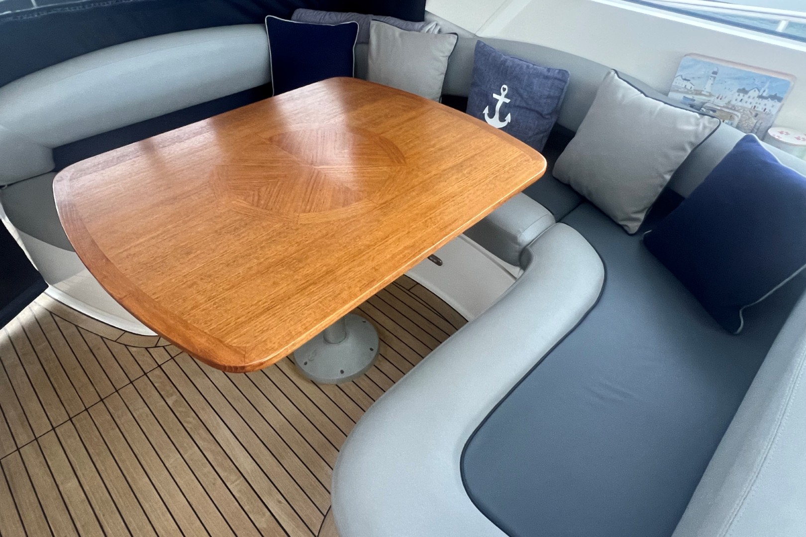 Recessed self-draining area on foredeck with coachroof sun cushions