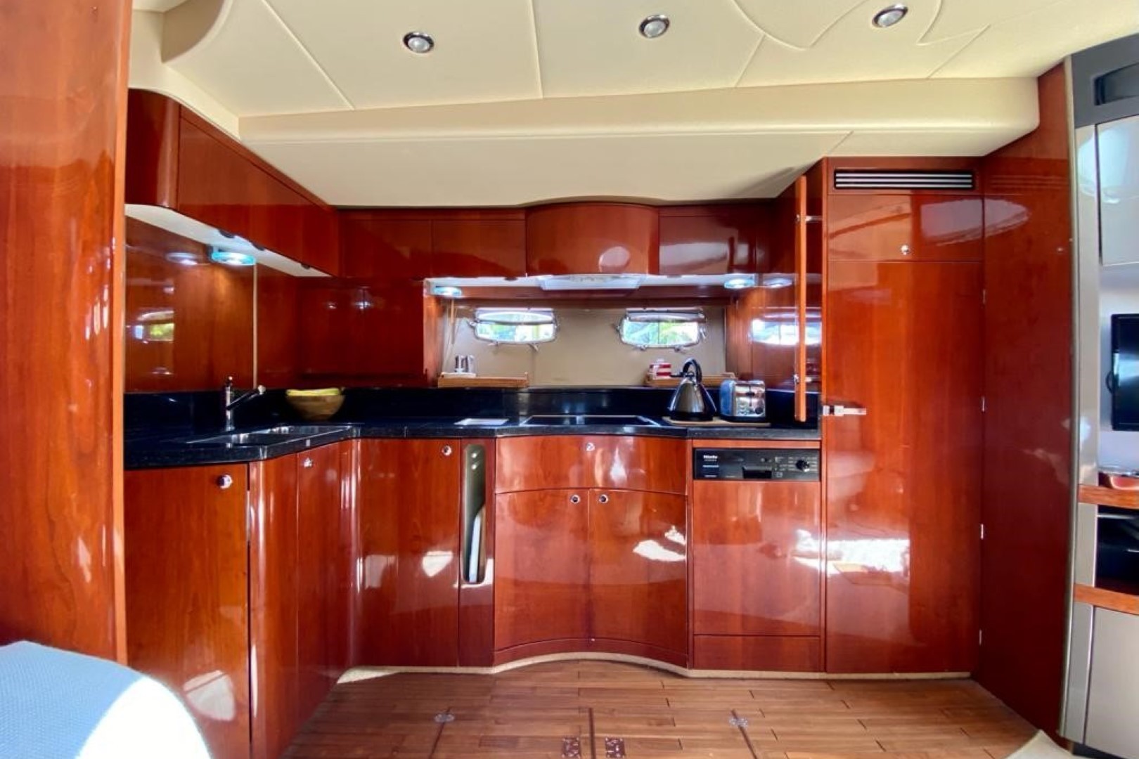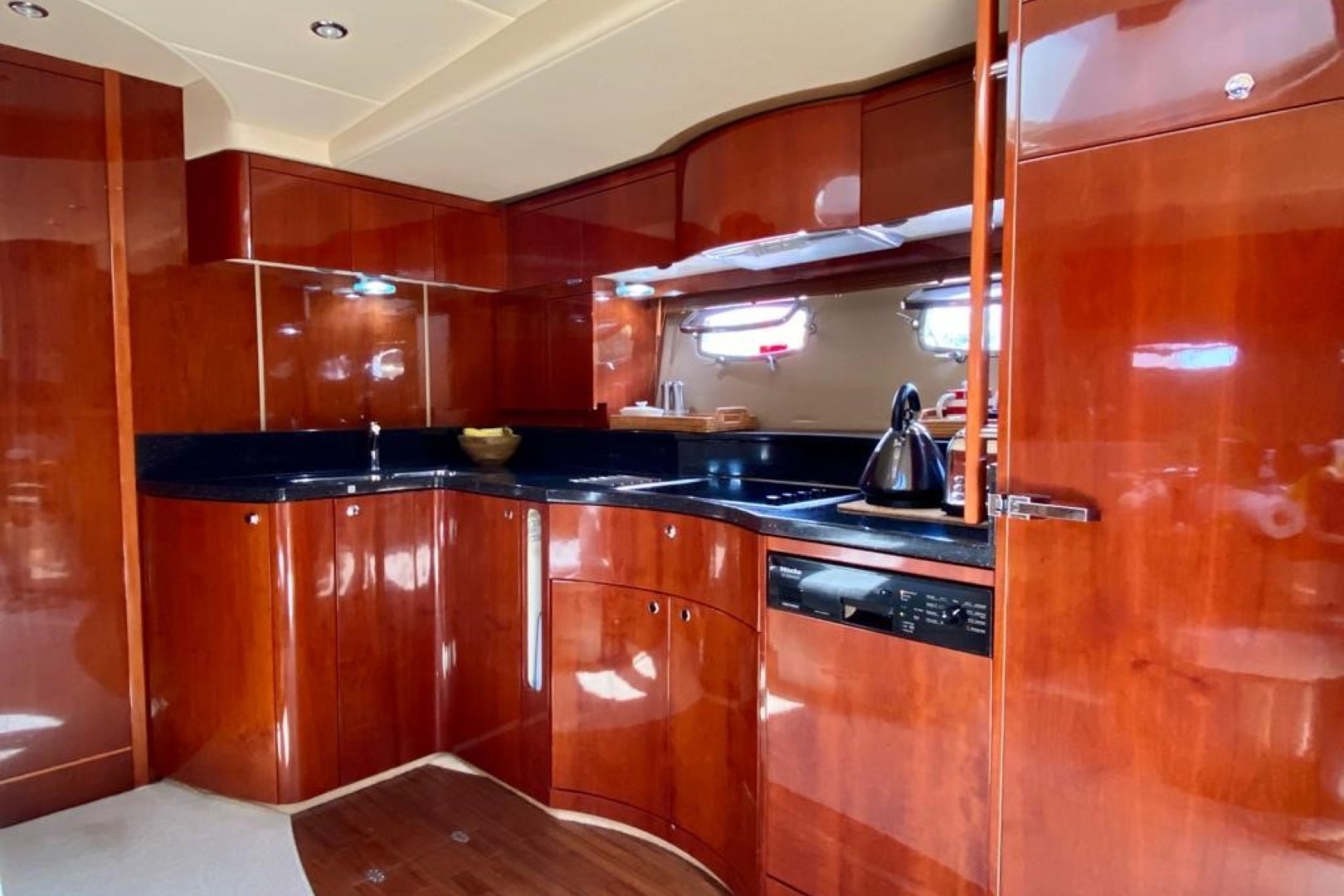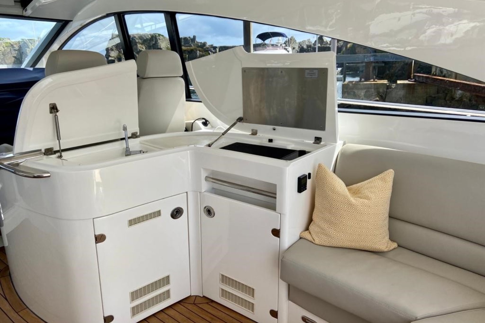 Full cockpit galley area including griddle, fridge, icemaker, coolbox, sink and waste bin