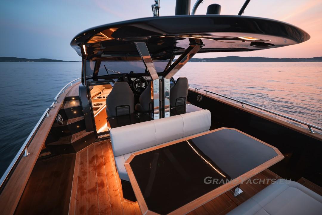 Cockpit Walking at level from the stern platform leads you into the large, open cockpit. You’ll immediately notice two major features: the first being an almost abnormal level of attention to detail and finish I like to call ‘The Focus Touch.’ The second thing is the strong spatial effect, mostly due to the unrestricted fore-and-aft movement and the wraparound hardtop screen, providing unrestricted vision anywhere in the cockpit. Directly aft is an extended sunbed both spacious and comfortable, an indispensable feature on any open sports cruiser. Take a couple more steps forward and you’ll be standing in front of a well-built wet bar which is nearly invisible in closed position. Lift the high-gloss kerrock counter to reveal a stainless steel sink and faucet, as well as an electric grill. The open-air galley also includes storage space, a compartment for litter and space for a wine-cooler. The aft side of the cockpit houses a six-man dining station with an adjustable wood-and-steel table. The sunpad area is stretches along the aft side, which, in conjunction with the non-rounded corners, provide the ultimate lounging experience. It's hard to talk about the cockpit without mentioning the helm. The console is raised compared to the rest of the cockpit, which is essential for good vision as well as being aesthetically pleasing. The vessel is operated from the centre of the three marine-grade, double stitched leather bucket seats, facilitating unimpaired movement for the observer. The solid teak sliding footrests are a very welcome addition, improving comfort while simultaneously being pleasing to the eye. The digital steering wheel is not only mesmerizingly beautiful, but adjustable as well to suit your preferences. The high-gloss, gel coated black dashboard is a dream come true for any captain, housing a bevy of state-of-the-art instruments. A raised panel below the compass contains all the digital engine gauges, as well as the alarm lights. Various waterproof switches are also present, as well as a 12 V USB socket. A rudder angle indicator and a Tridata (Depth / Speed / Trip) display are also standard equipment.