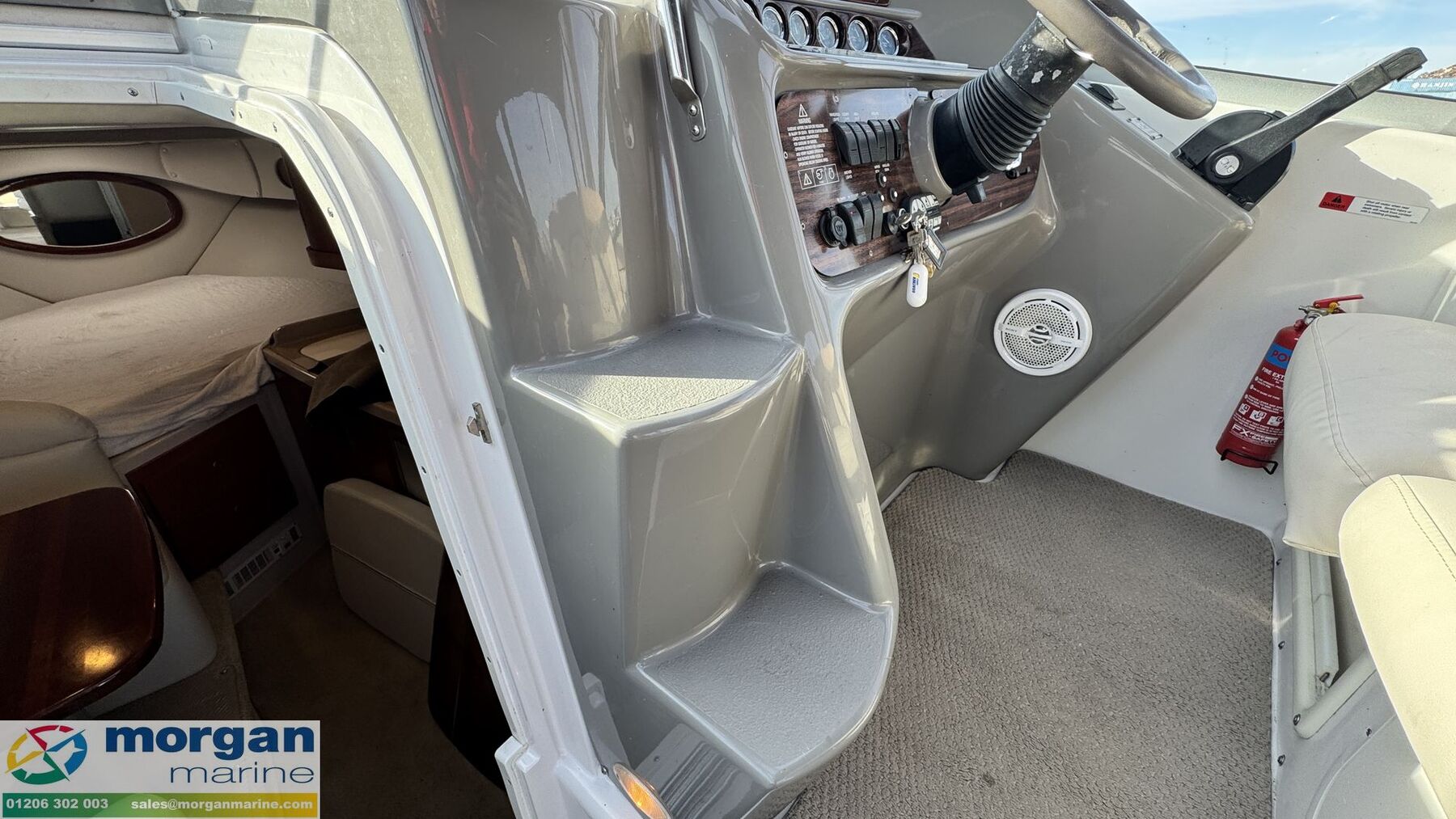 Cockpit: Starboard side U-Shaped cockpit style cushioned seating with table - converts to a large single berth. Port side cockpit galley with sink and storage. 2x Port side chairs with table. Gate to cockpit. Walk through windscreen with steps to bow area. Cup holders. Cockpit removable carpet. Pilot bench seat with backrests with engine dash, steering wheel and engine controls.