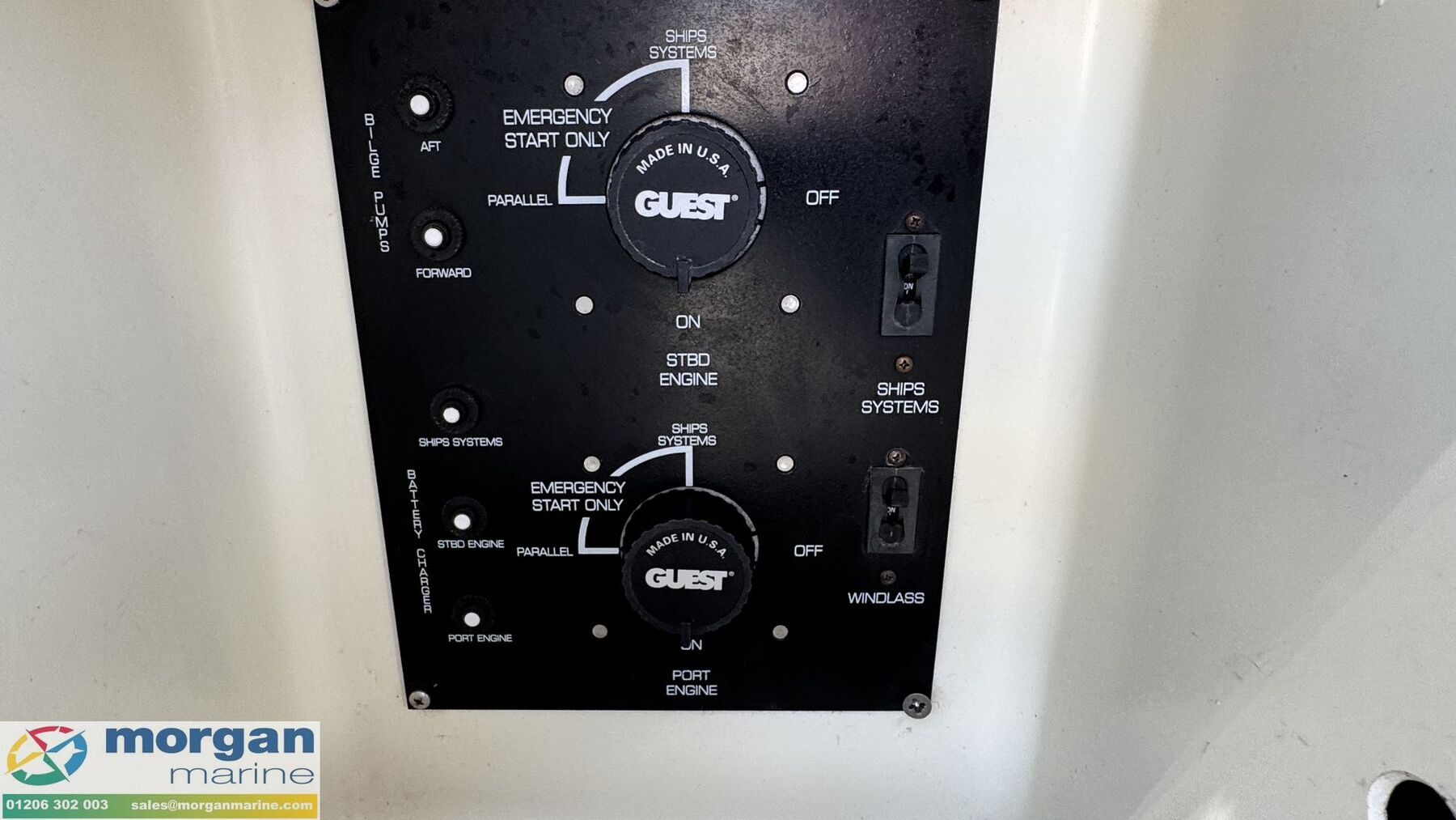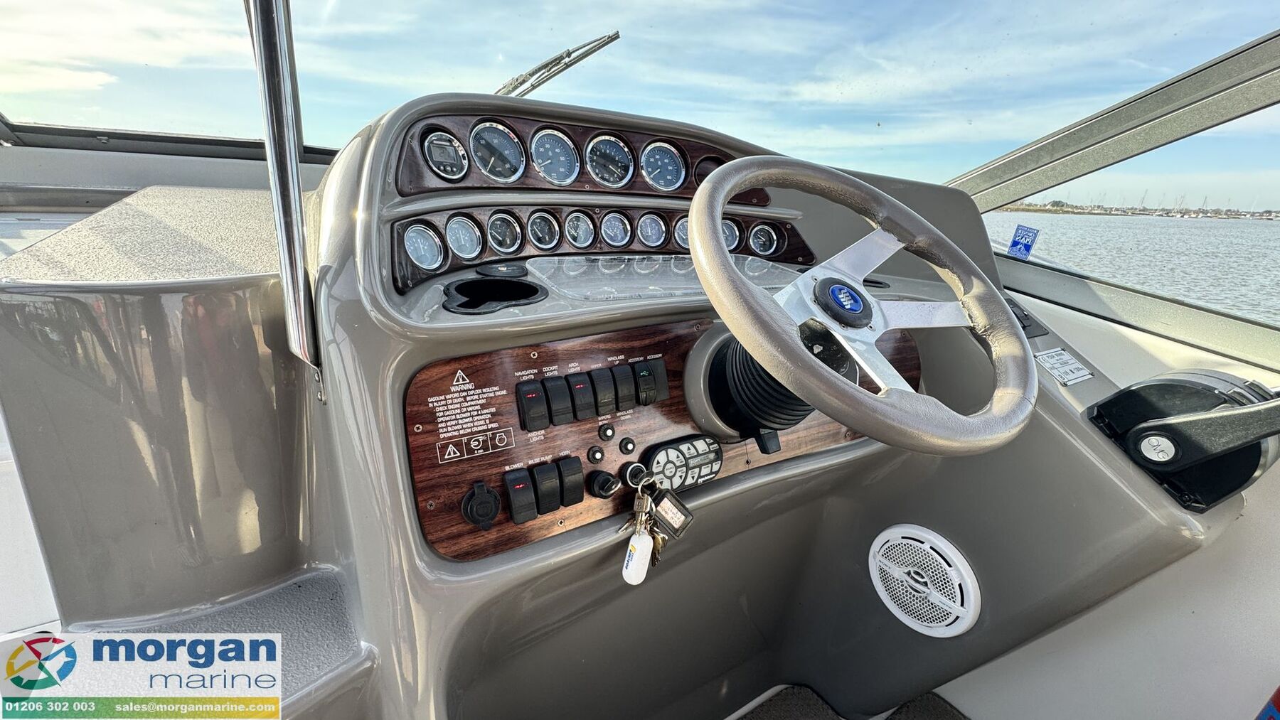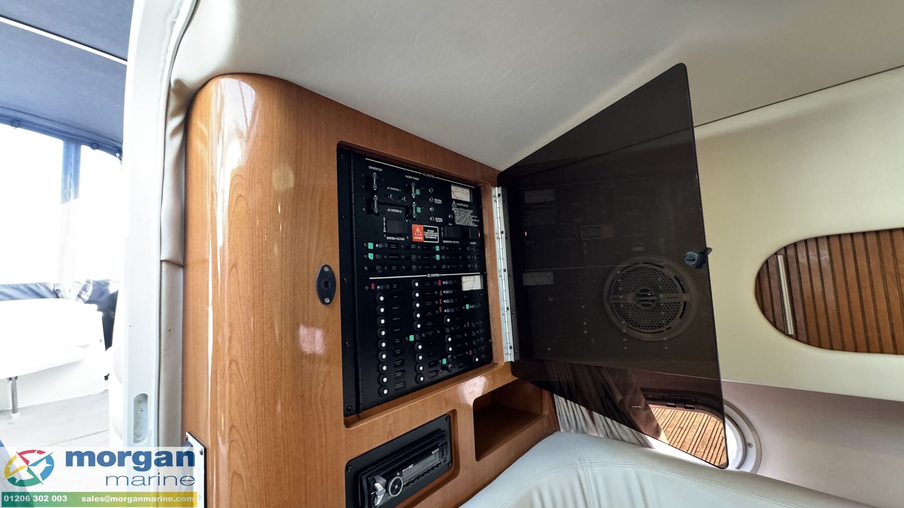 Electronics: Sony sound system with speakers. USB socket. Switch panel. Navigation lights. Anchor light. Engine gauges. Compass. Manual and automatic bilge pump. Shore power with lead. Electric wiper blades. Horn. Cockpit lights. Interior lights. Isolator switches.