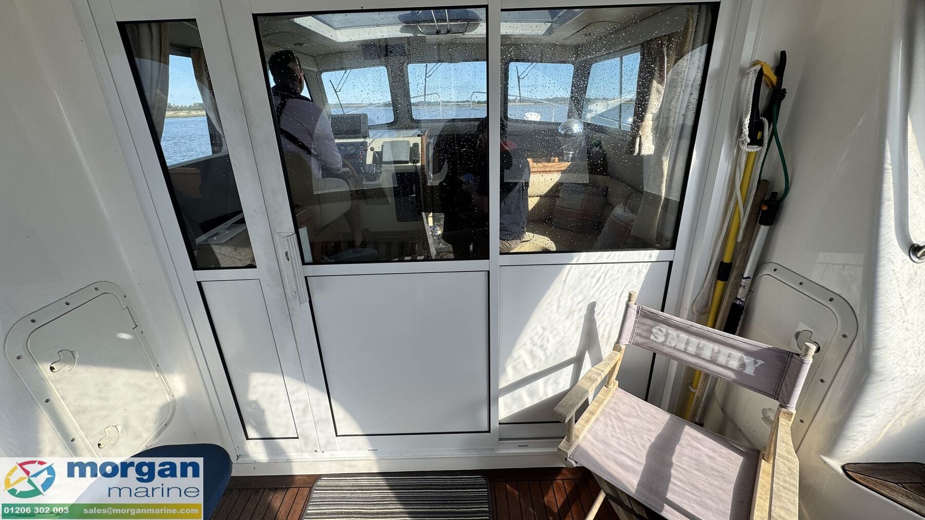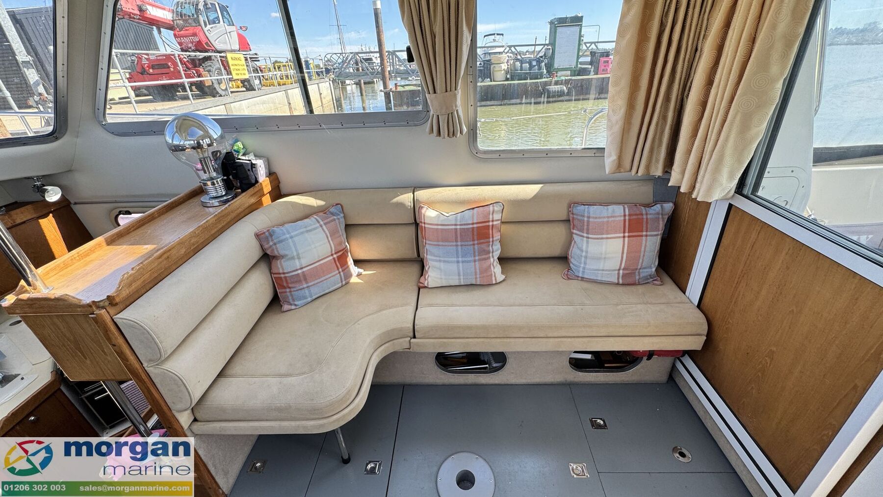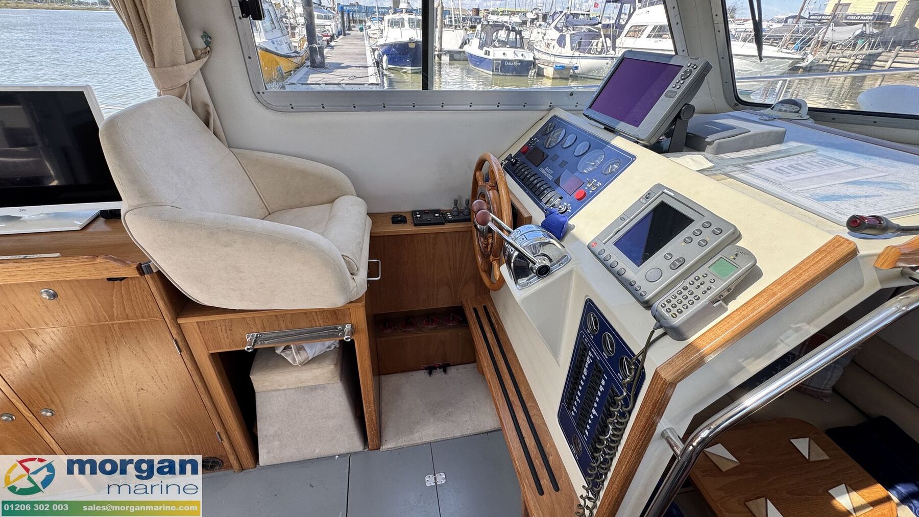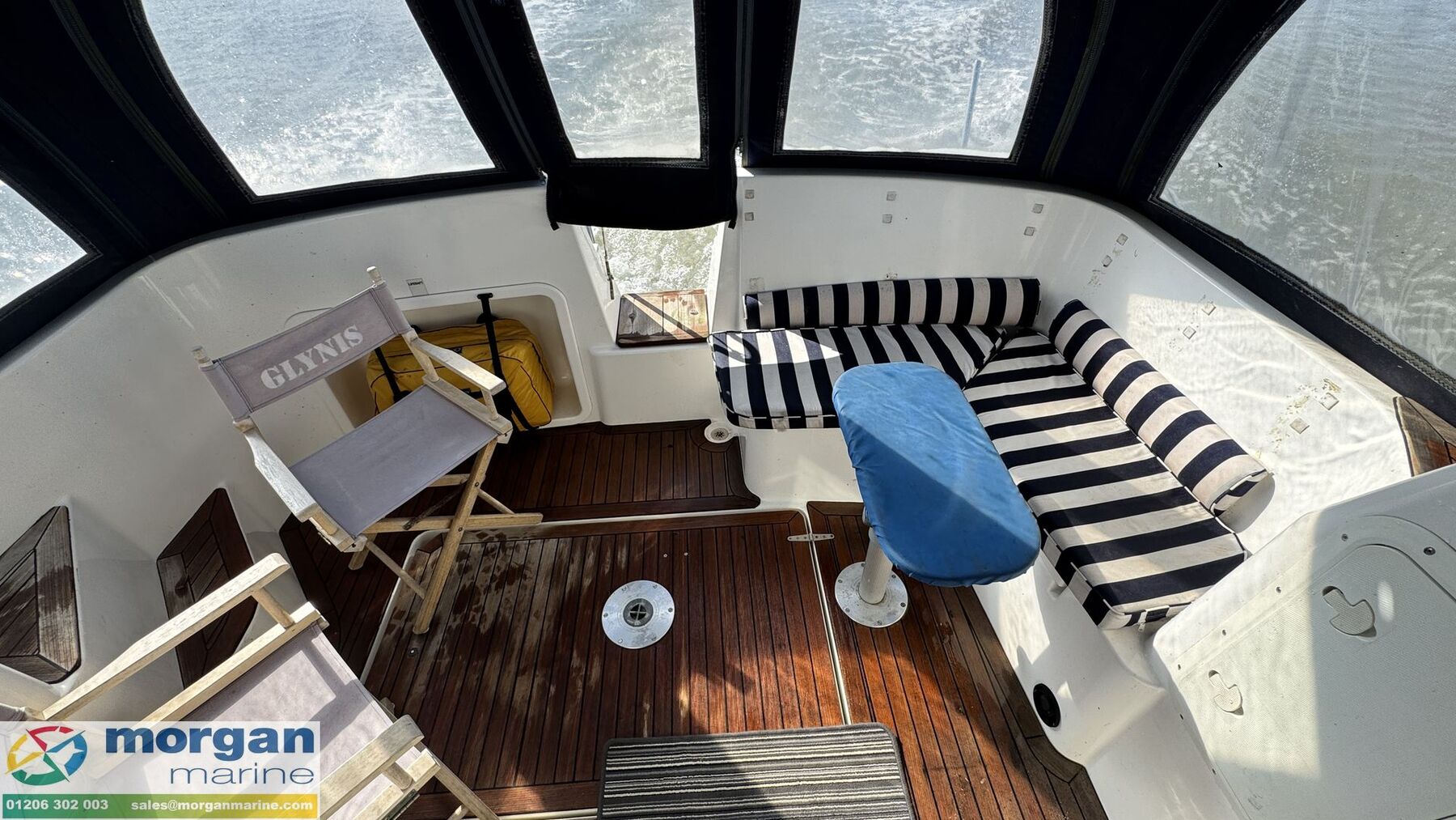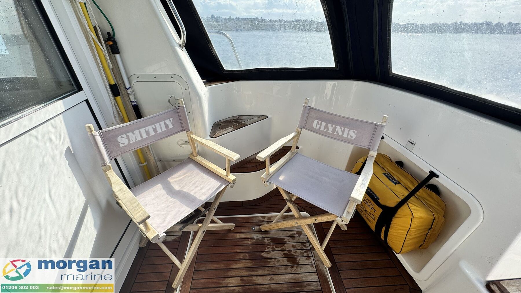 Cockpit: Large cockpit area with teak decking. Cockpit cushioned seating with table. Removable personalised deck chairs for extra seating. Deck locker. Pilot station with pilot chair, all-round windows, dash with engine controls and throttle. Divided hatches offering excellent access to the engines, gearboxes, stern glands, raw water filters, diesel filters, batteries, battery charger, sea cocks. Engine gauges on dash including - temperature, RPM, and oil pressure. Large cockpit storage locker.