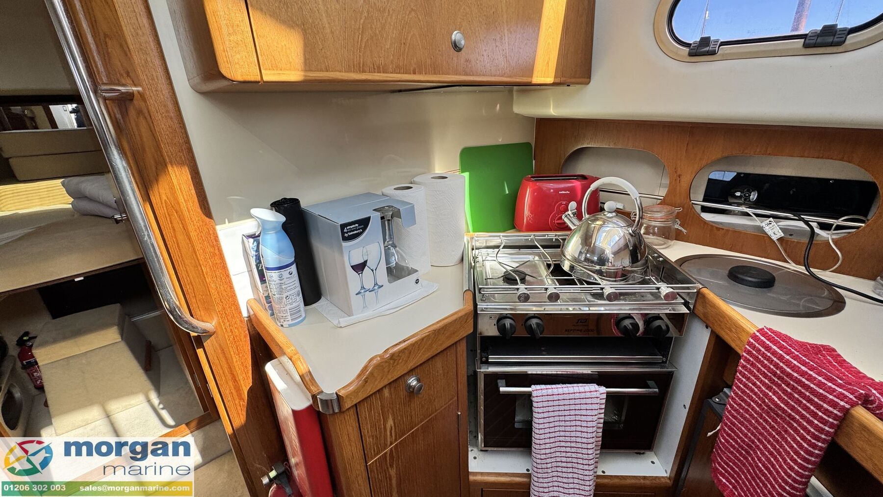Cabin: Forward V-shaped double berth with infill cushion, storage, and roof hatch. Large saloon U-shaped seating with table which converts into double berth. Galley with twin burner gas hob, grill and oven, twin sink with hot and cold mixer tap, fridge, microwave and lots of storage. Overhead galley locker storage. Good amount of light from large windows. Saloon L shaped cushioned seating with TV. Saloon storage. Large separate compartment with sink, toilet, storage and porthole.
