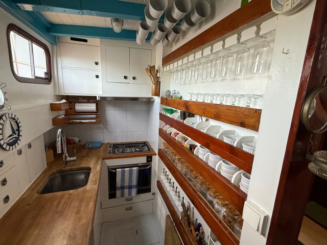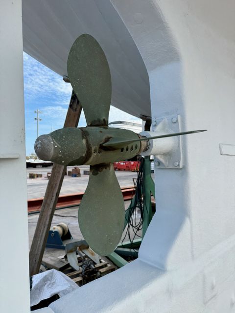 El motor, un GM Detroit diésel de 6 cilindros y 2 tiempos — robusto y económico — ha sido completamente reconstruido. Es una verdadera “casa flotante” equipada para la navegación de altura.
