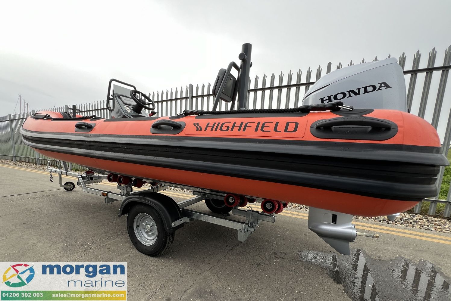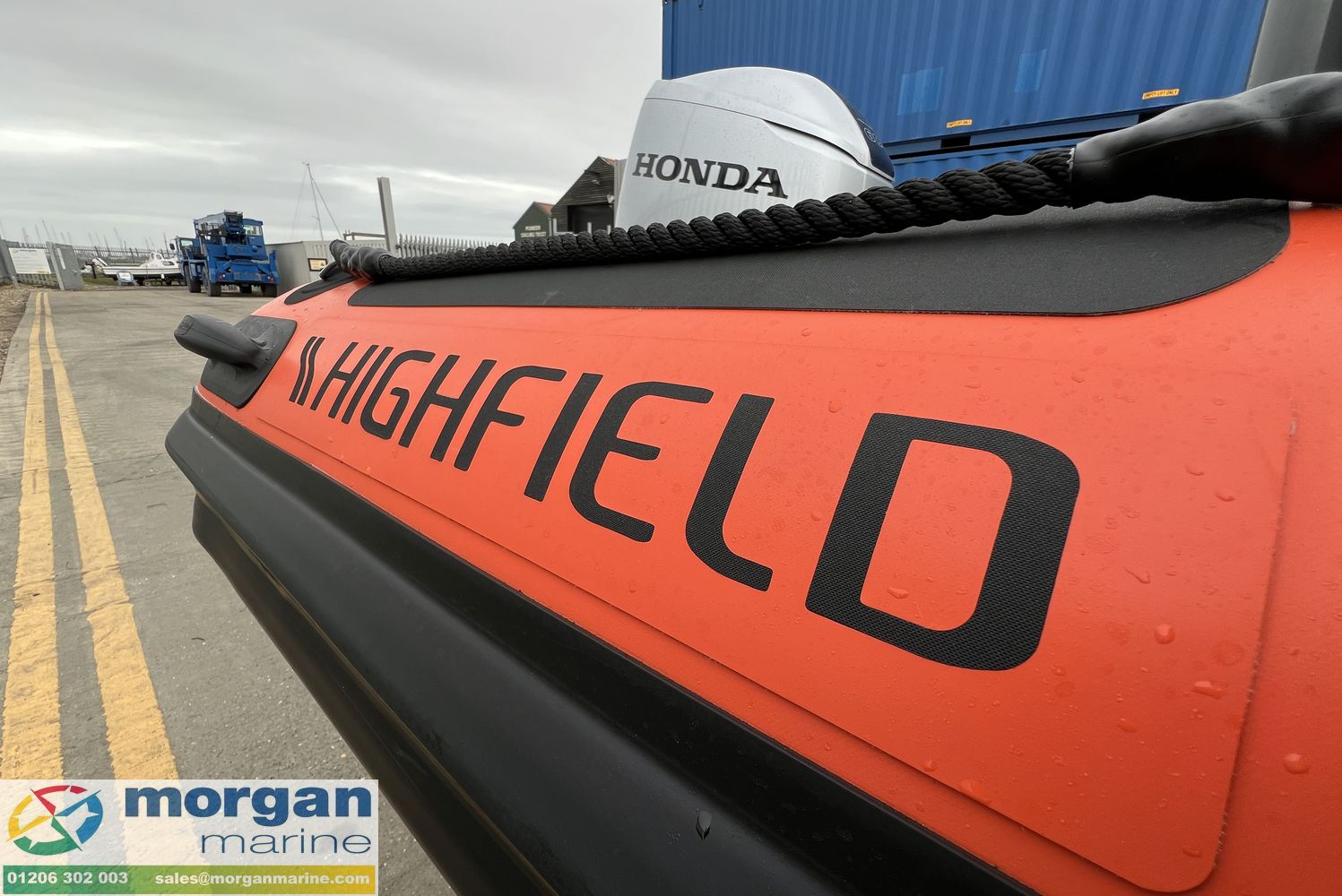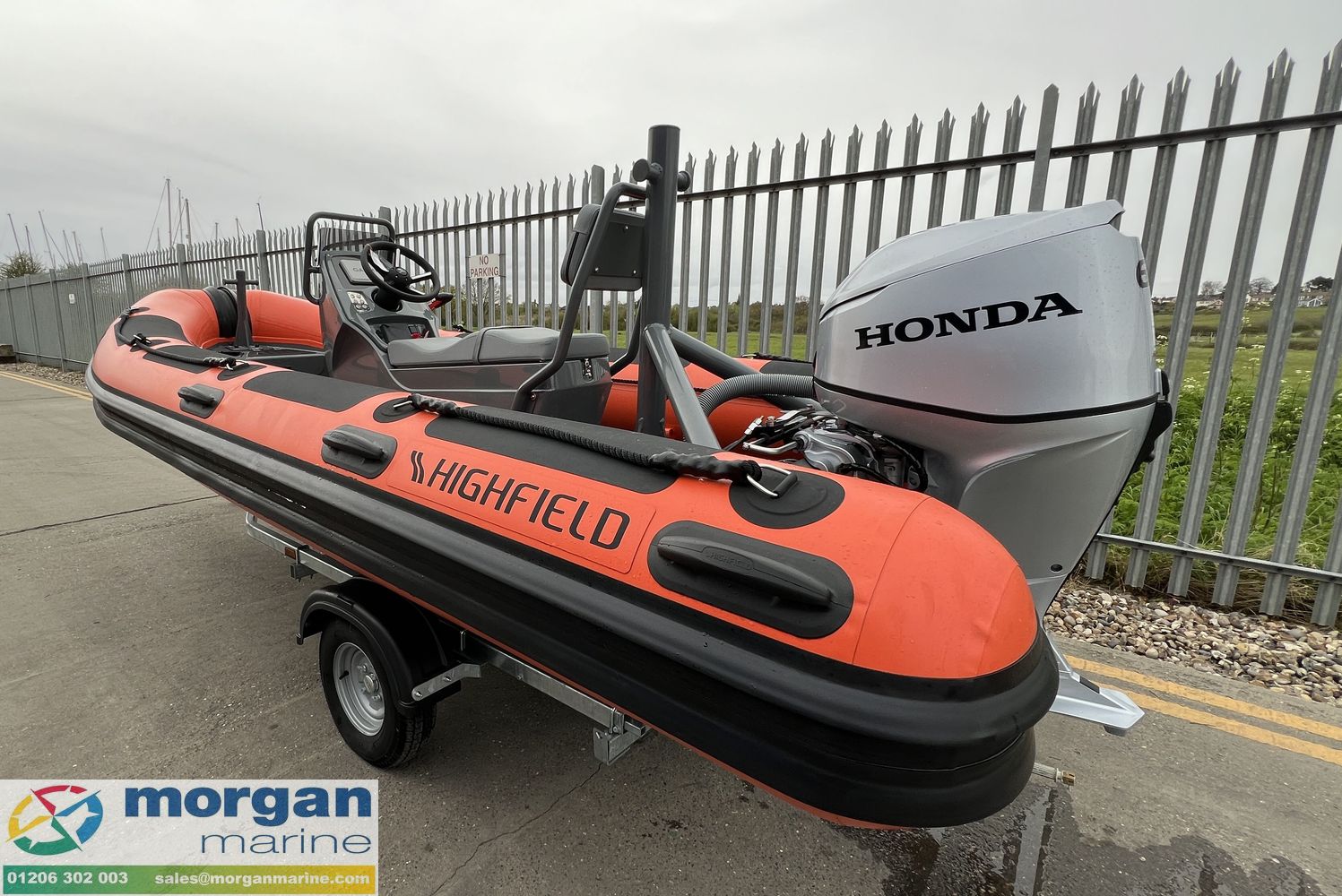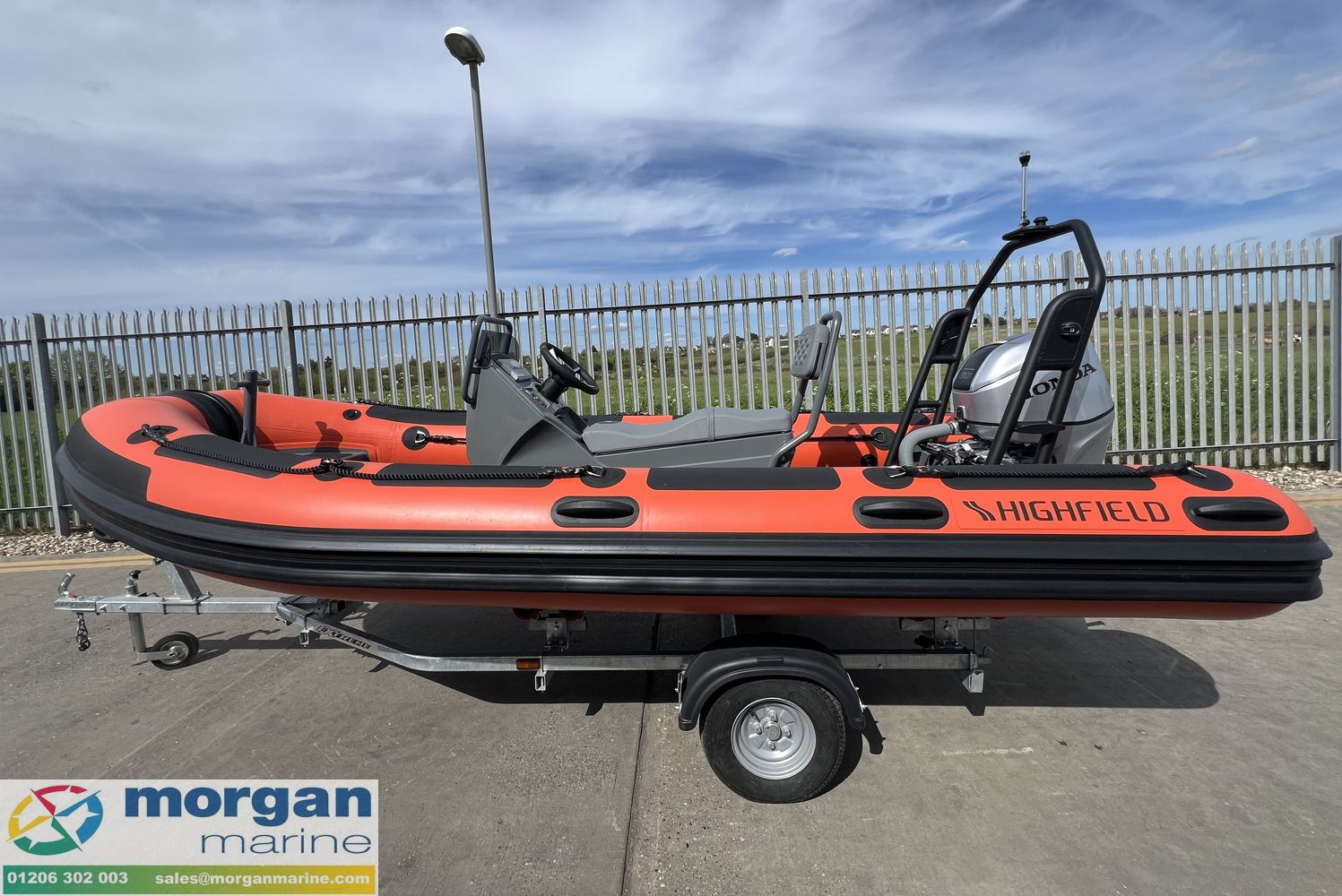 Highfield Patrol 460 aluminium RIB with Honda BF60 LRTU outboard and capacity of 9. With choice of either rear tow post or A-frame. A rugged and tough design perfect for the requirements of sailing clubs and commercial operators or for those who want a quality tough Rib. The Patrol range of commercial quality RIBs are designed to work both excellently as a long distance family cruiser or a hardcore work boat. Built to withstand the toughest of conditions. The hull is built from 5083 aluminium plates with 6 and 10mm stringers. With their super deep V, wide chines and large diameter tube, they offer high manoeuvrability, high safety and a soft dry ride even in the roughest conditions. The Highfield Patrol range of RIBs offers something for almost every requirement, from Sailing club support to Police and Rescue applications. The Patrol boats carry large loads and plane quickly and easily with little horse-power. For charter boat and commercial operators, the modular set-up option means that we can build a layout that suits your needs. These boats are ideal pursuit craft or work boats and can be configured with different seating and console options. When safety, toughness & reliability really matter, the Patrol range should be your first port of call. Design category C. NB - library photos may not reflect specification of boat.