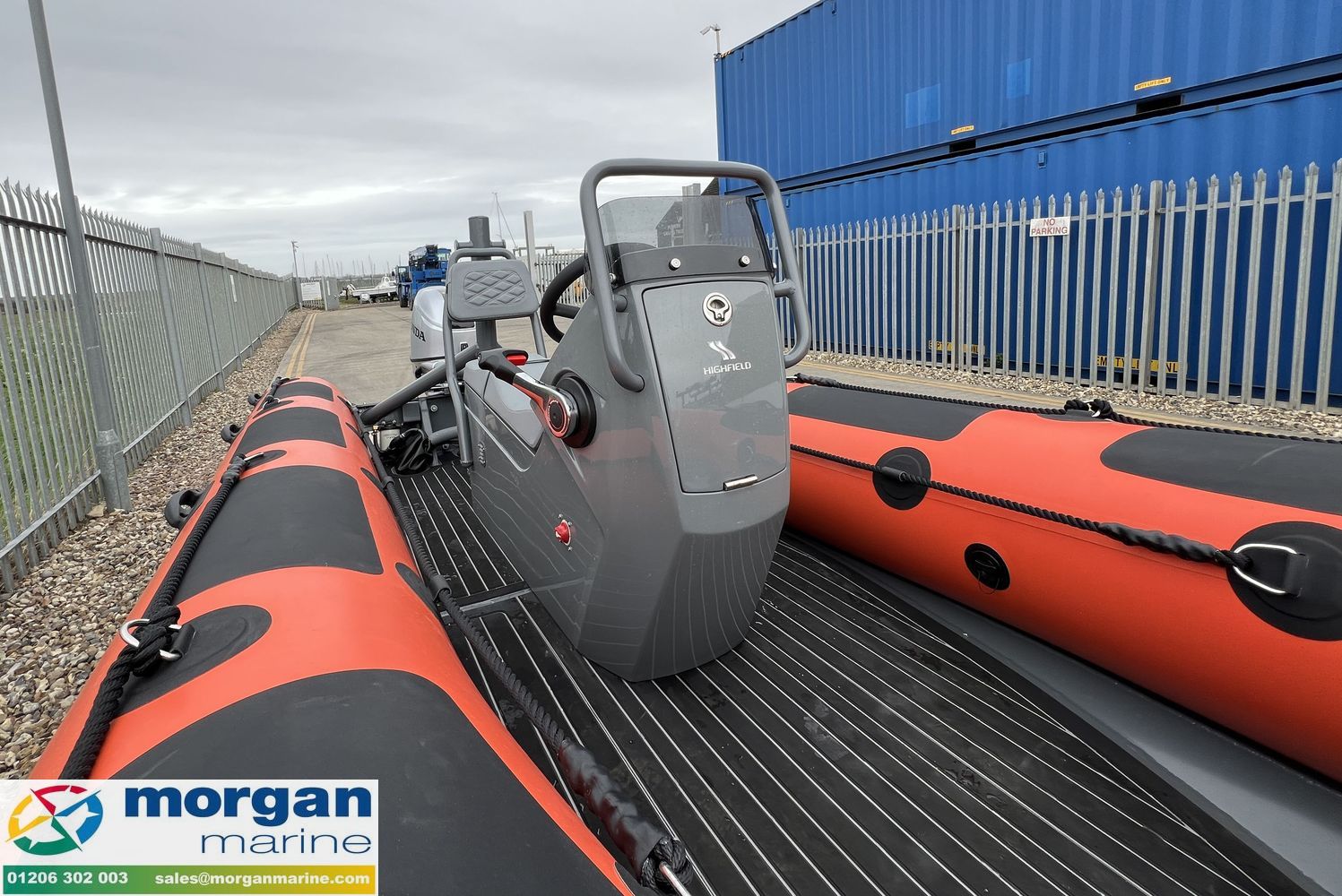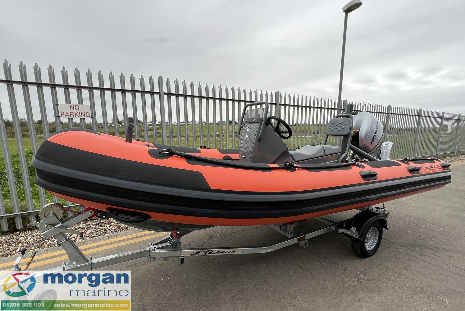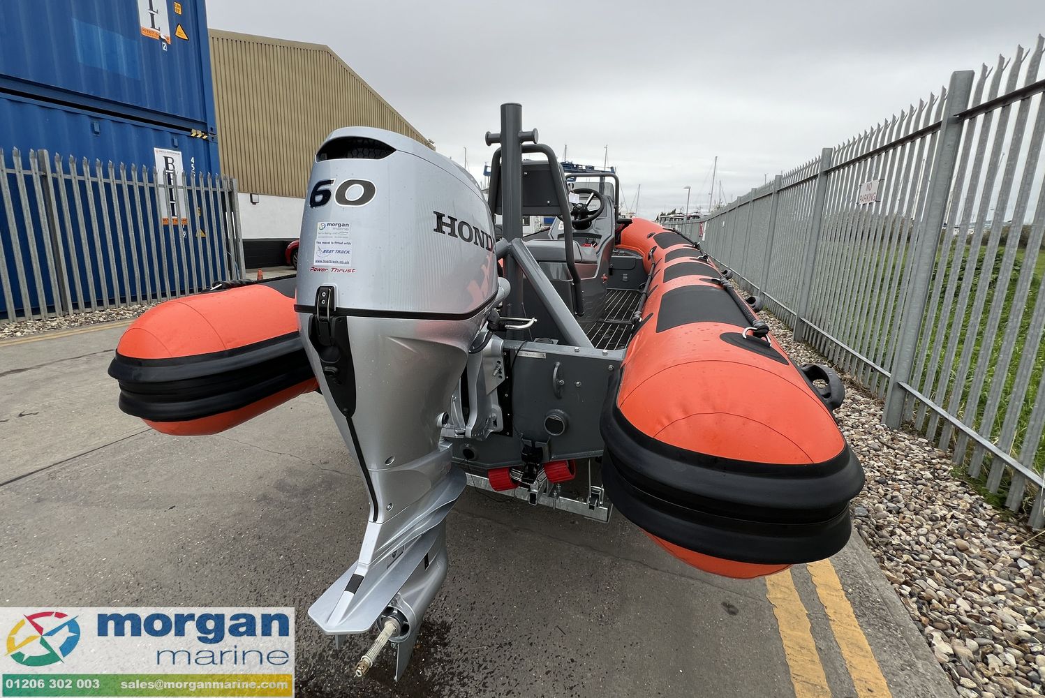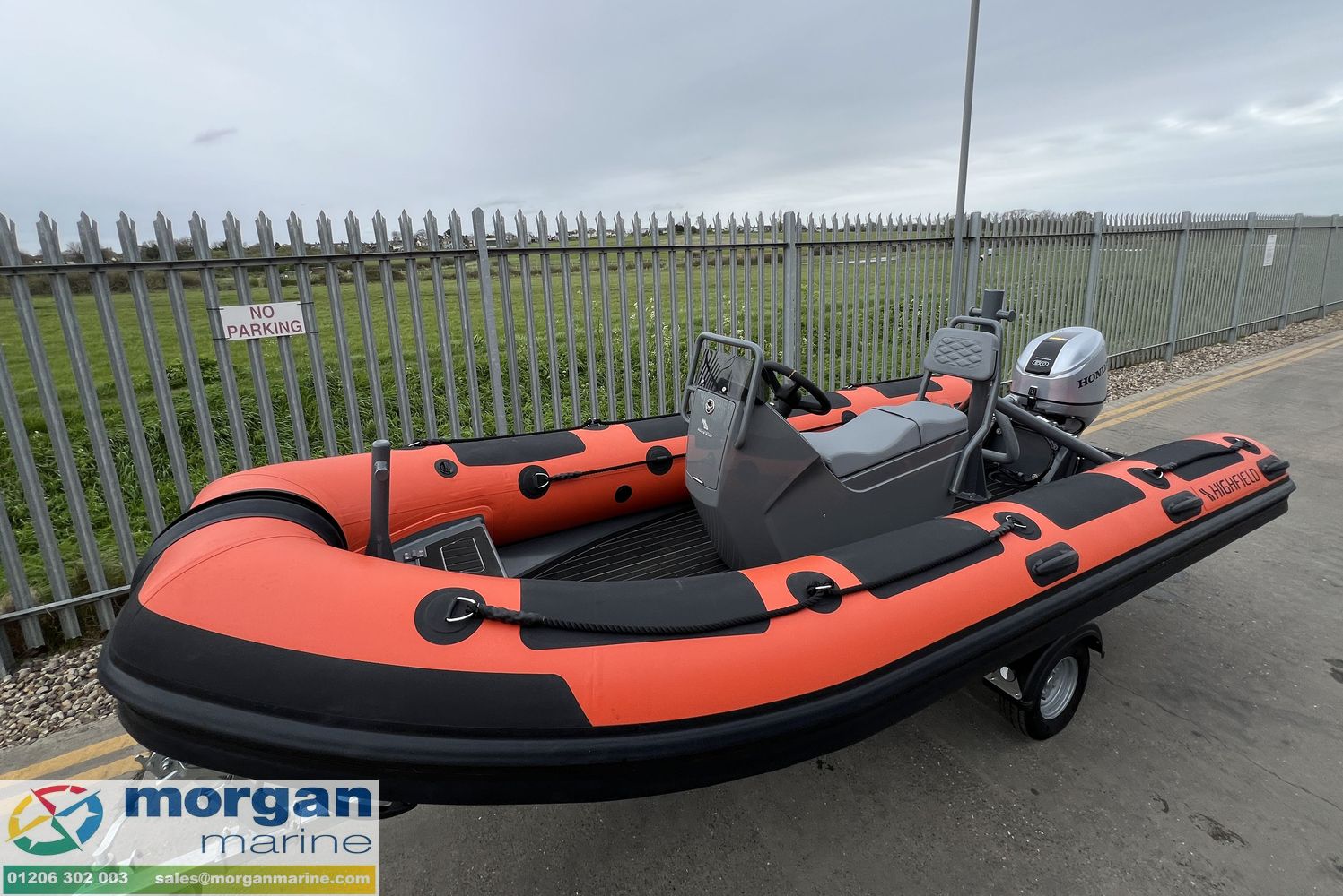 Highfield Patrol 460 aluminium RIB with Honda BF60 LRTU outboard and capacity of 9. With choice of either rear tow post or A-frame. A rugged and tough design perfect for the requirements of sailing clubs and commercial operators or for those who want a quality tough Rib. The Patrol range of commercial quality RIBs are designed to work both excellently as a long distance family cruiser or a hardcore work boat. Built to withstand the toughest of conditions. The hull is built from 5083 aluminium plates with 6 and 10mm stringers. With their super deep V, wide chines and large diameter tube, they offer high manoeuvrability, high safety and a soft dry ride even in the roughest conditions. The Highfield Patrol range of RIBs offers something for almost every requirement, from Sailing club support to Police and Rescue applications. The Patrol boats carry large loads and plane quickly and easily with little horse-power. For charter boat and commercial operators, the modular set-up option means that we can build a layout that suits your needs. These boats are ideal pursuit craft or work boats and can be configured with different seating and console options. When safety, toughness & reliability really matter, the Patrol range should be your first port of call. Design category C. NB - library photos may not reflect specification of boat.