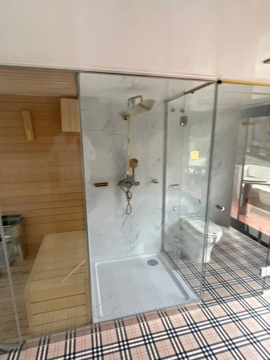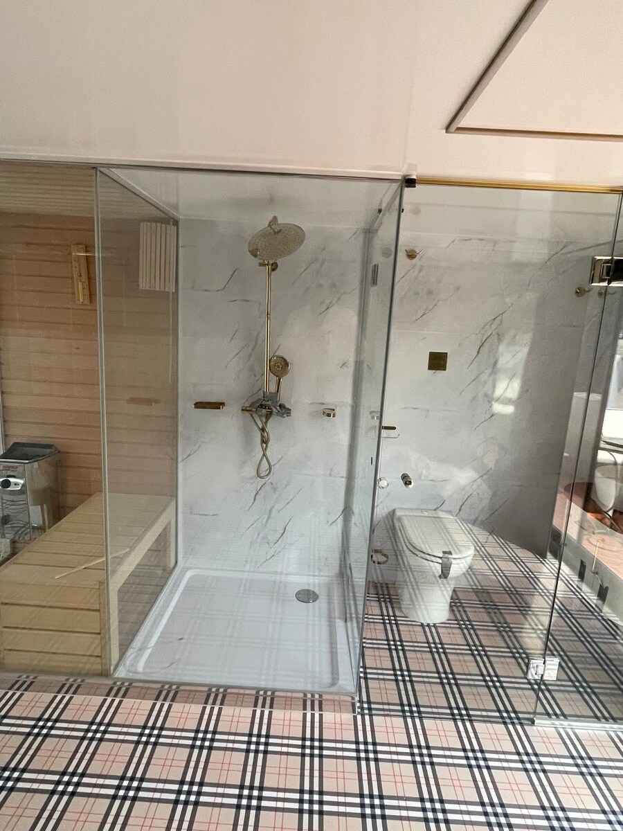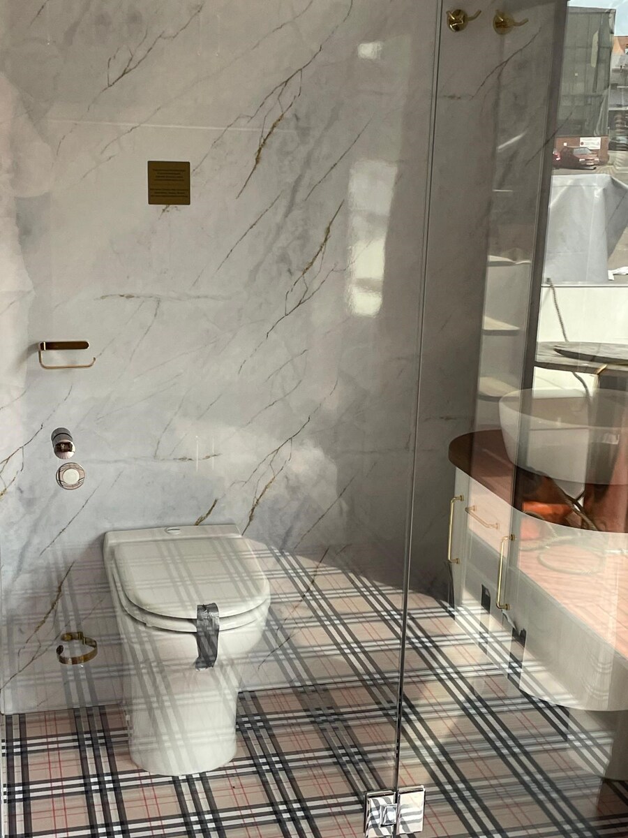 Burberry-Fußboden: Ein echter Hingucker – der Boden ist im ikonischen Burberry-Karomuster gestaltet und verleiht dem Raum einen edlen, britisch-klassischen Touch mit moderner Note.