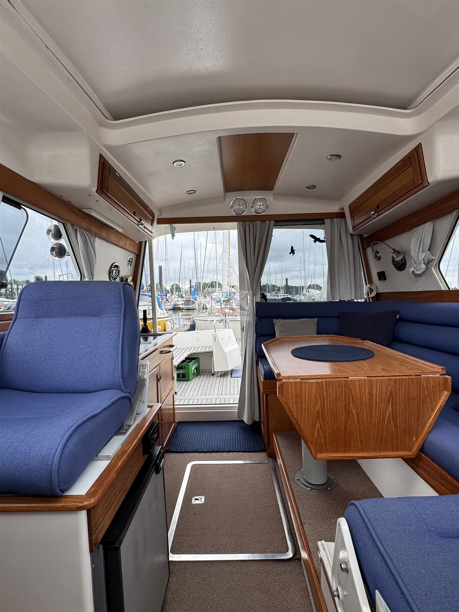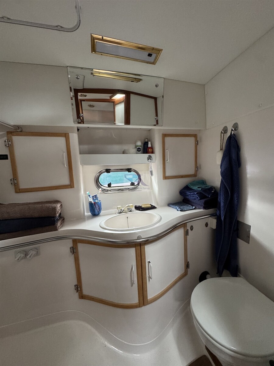 Engine Alarm, Anchor (mit 30m Kette), Water pressure pump, Auto-Trim (Lenco 230 x 610 mit Mente Steuerung (Neu 2023)), 5 Batteries (3x Marine Power 12V/108Ah, 1x 53Ah, 1x 110Ah), Deck Shower, Stern Thruster (mit Betriebsbatterie), Directional Spotlight, Hard top, Fire Extinguishing System, Solar panels (VOTRONIC), Platform, Automatic Bilge Pump, Manual Bilge Pump, Entry door, Teak Cockpit, Shorepower connector, Water harbor connector system, Electric Windlass, Manual Windlass, swimming ladder, cockpit table, Living Room Foldable Table (drehbar und absenkbar), guard rails with gates, Horn.