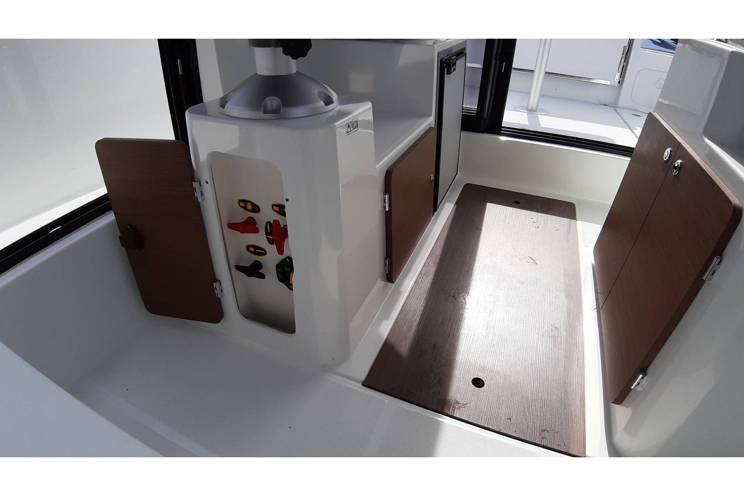 Deck: Electric windlass + self draining anchor locker + bow roller + anchor and chain. 2 forward chocks + 2x forward + 2x middle + 2x aft mooring cleats. Open front pulpits + handrails + side pulpits + aft cockpit handrails. Walk around side decks to bow. Folding aft cockpit bench (with cushion) + luxury folding port and starboard side benches (with cushions) + removable GRP box to form sunpad. 3x cockpit deck lockers. Swim platform with ladder + cockpit barrier. Cockpit side gate for easy access onto mooring. Fishing rod holders. Live bait tank (without oxygenation) + fish cutting table - to aft. Mooring kit – fenders and ropes. Removable aft cockpit table. Cockpit shower.