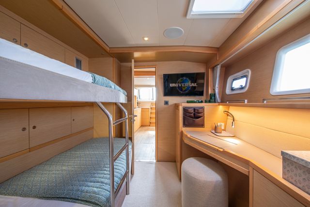 • 4 cabins - 4 bathrooms + crew cabin in the forward port bow, equipped with a bed, sink, toilet, and shower
