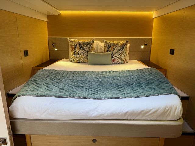 • Amplia cabina del propietario con baño privado en la popa de estribor (acceso directo al cockpit trasero)