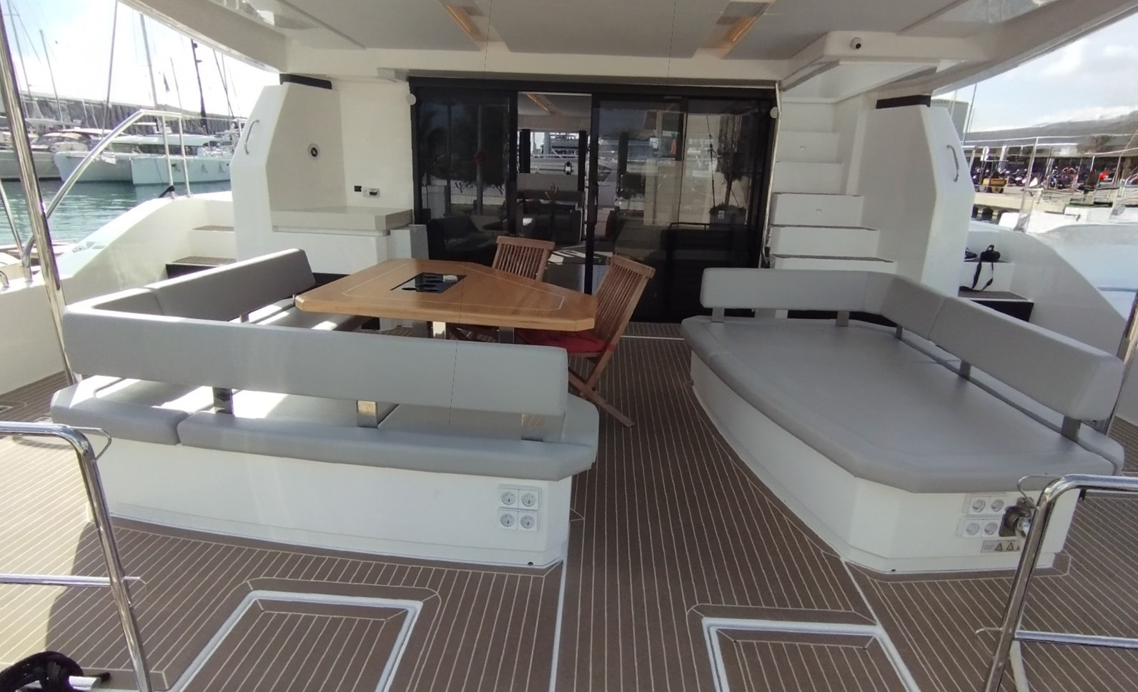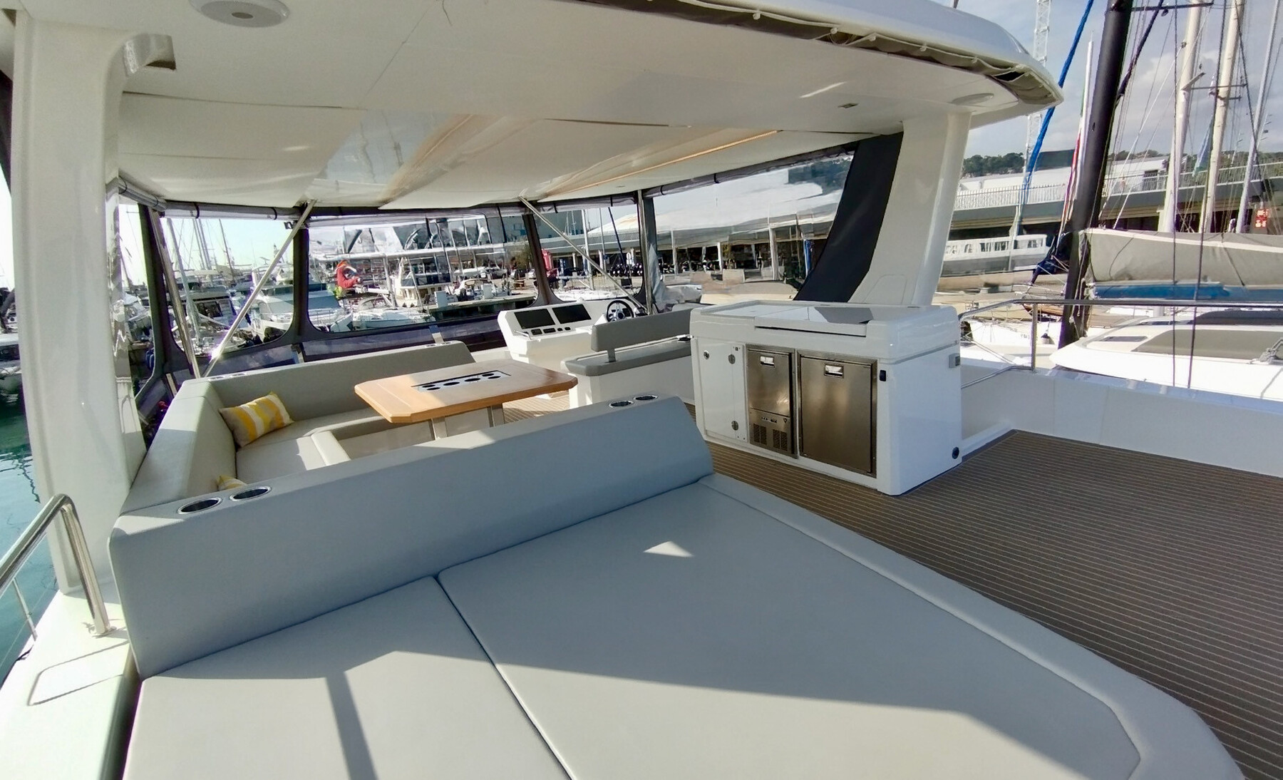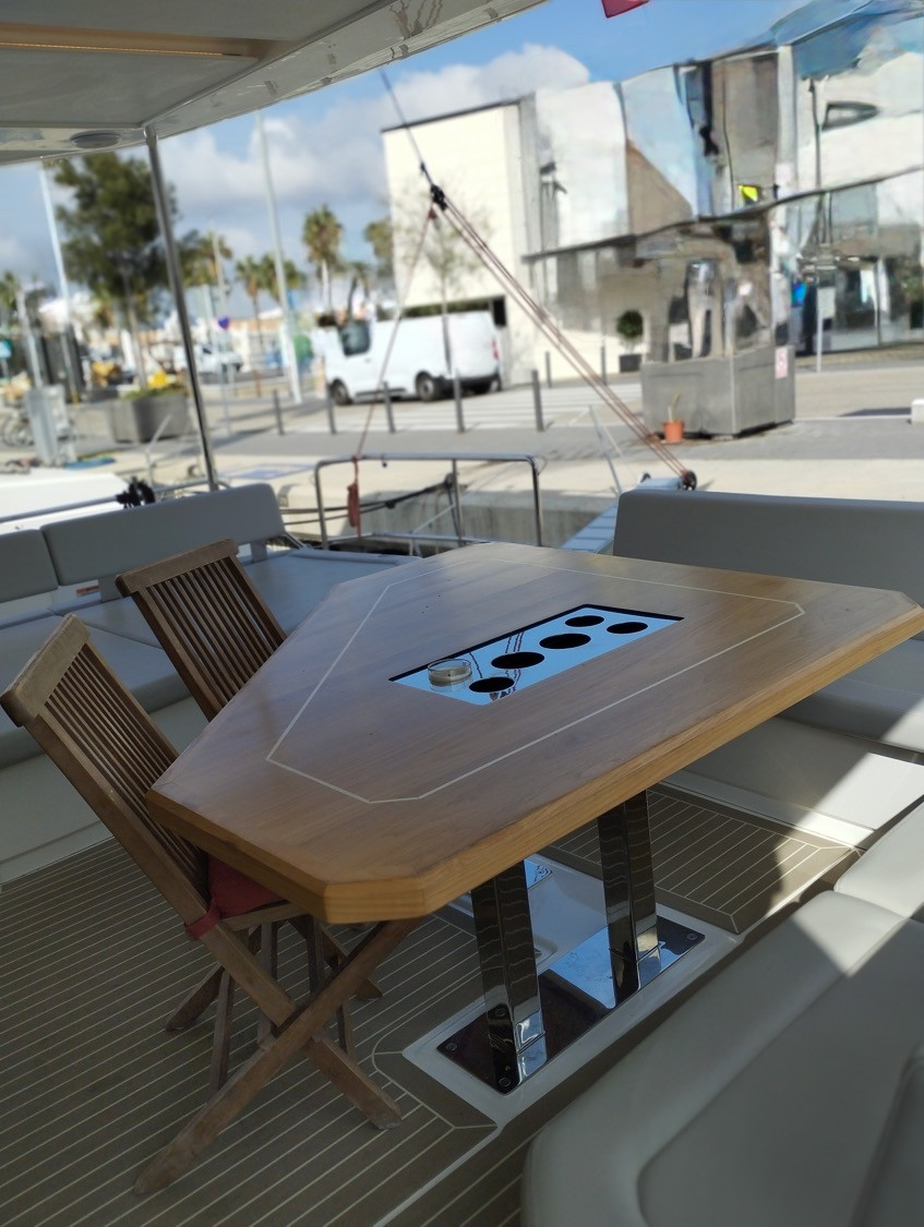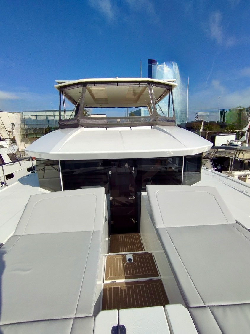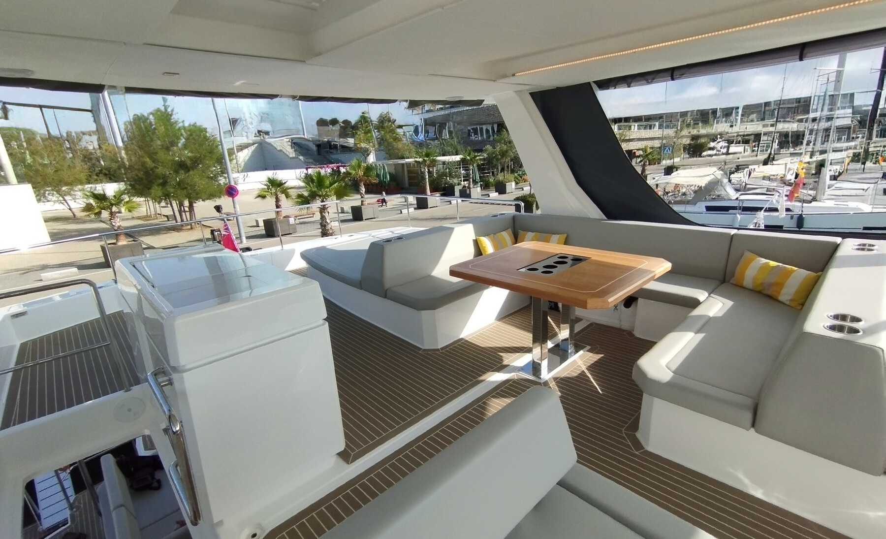 À l’extérieur vous trouverez une plateforme élévatrice avec treuil une table en teck sur le flybridge et dans le cockpit arrière des coussins ajustables à l’avant pour un confort optimal et un toit rigide sur le flybridge