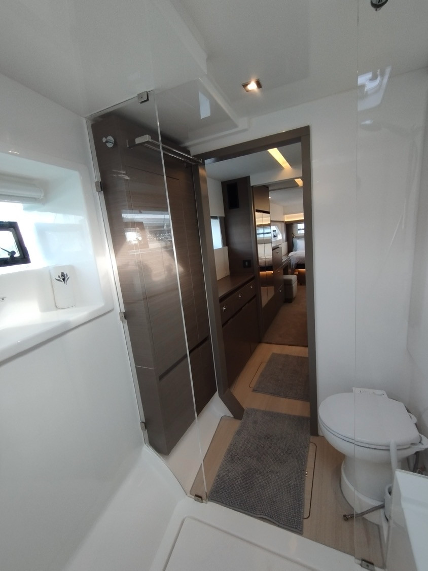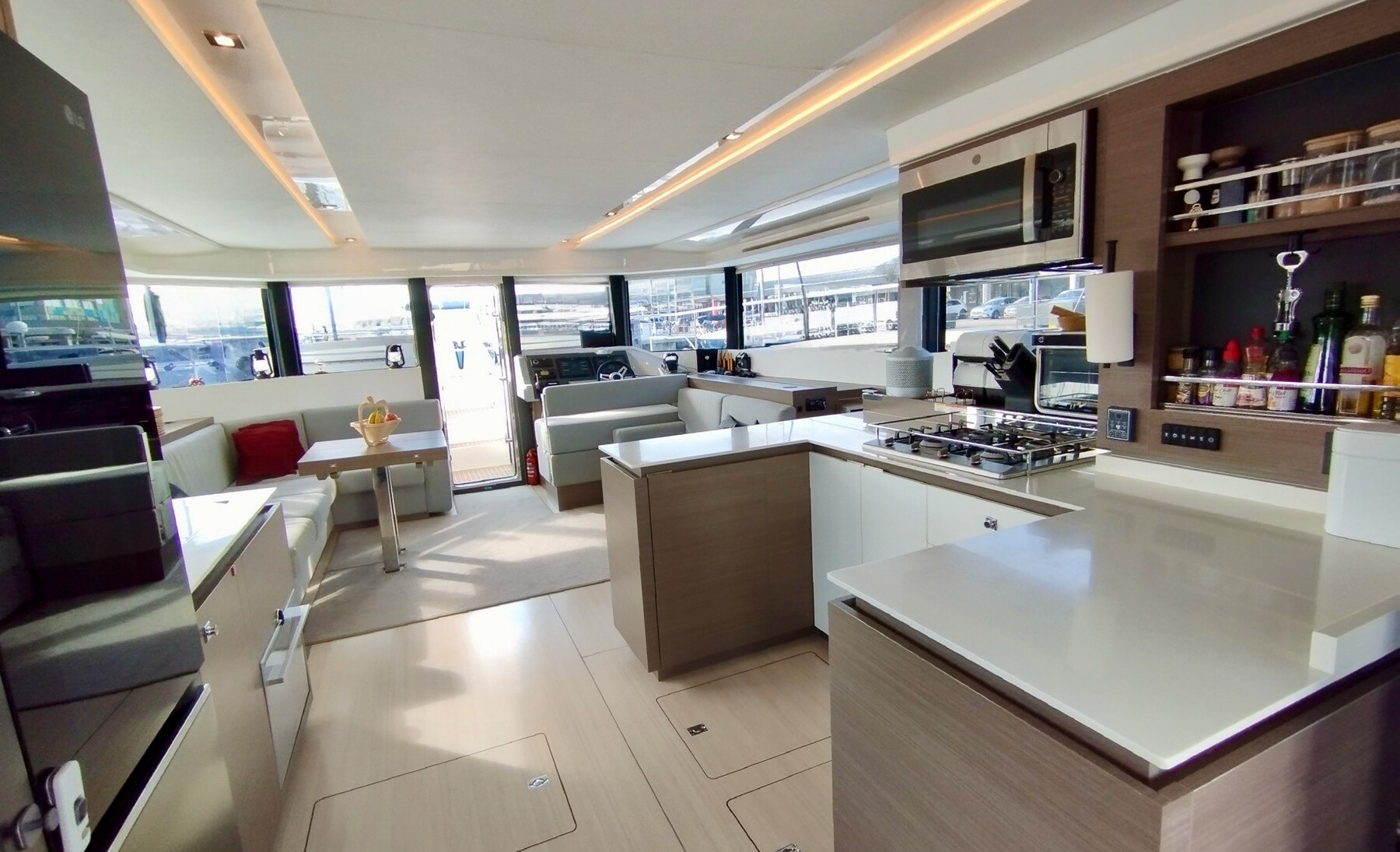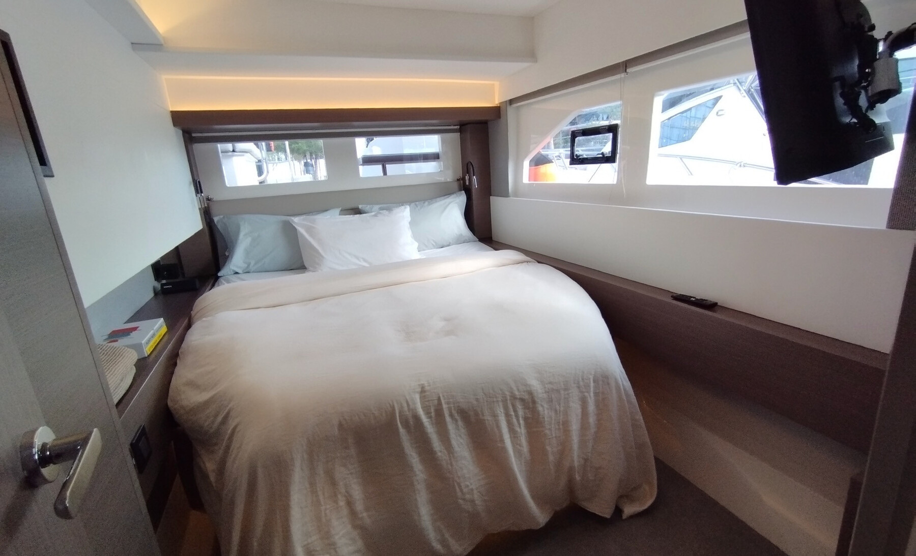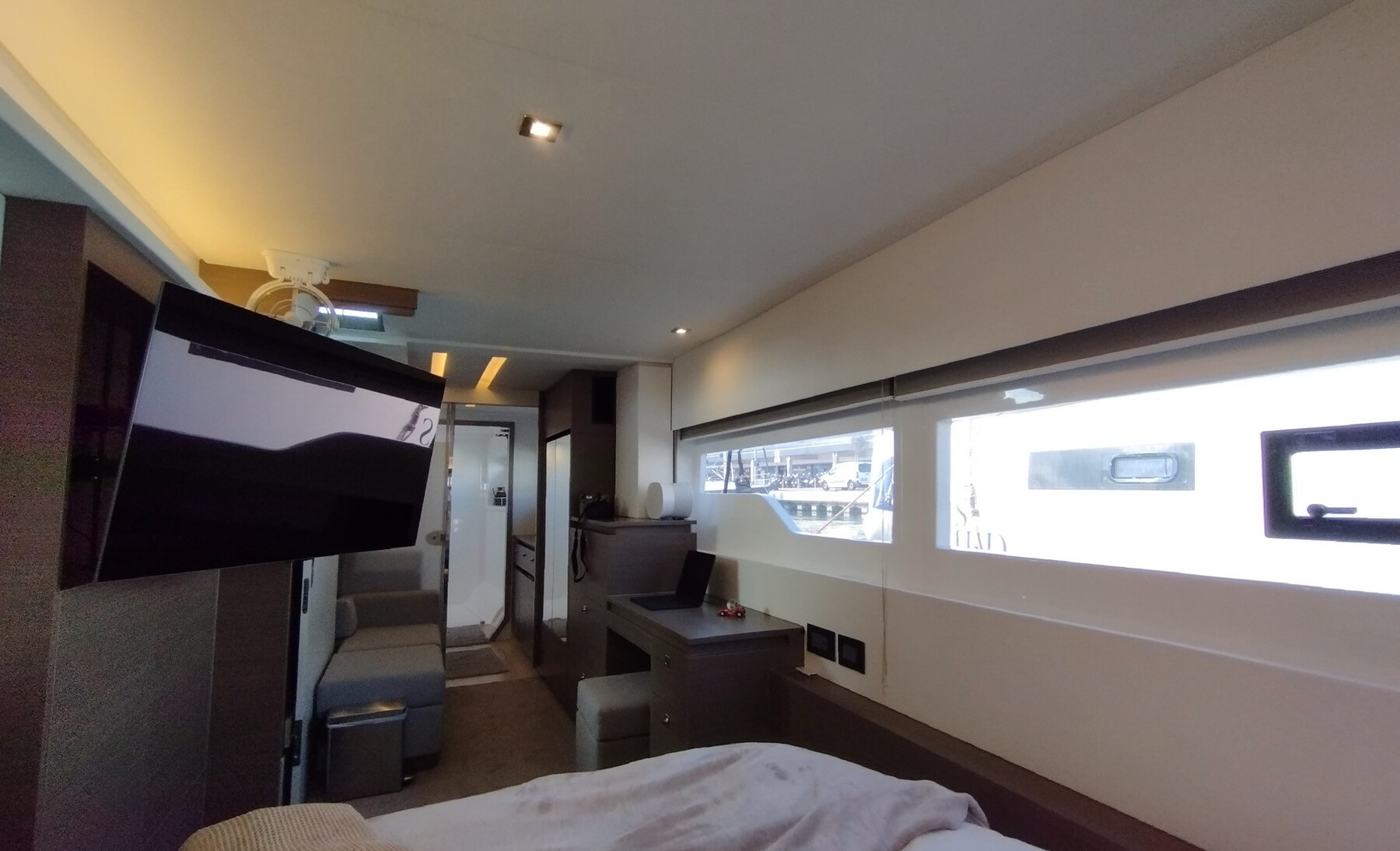 Il dispose de 3 cabines spacieuses avec des lits queen-size et 3 salles de bains équipées de toilettes électriques à chasse d’eau avec eau de mer Le design intérieur se distingue par un ensemble de tissus d’ameublement de haute qualité des tapis dans les cabines et le salon un éclairage LED bleu de courtoisie et des téléviseurs LG Oled dans le salon et les cabines secondaires